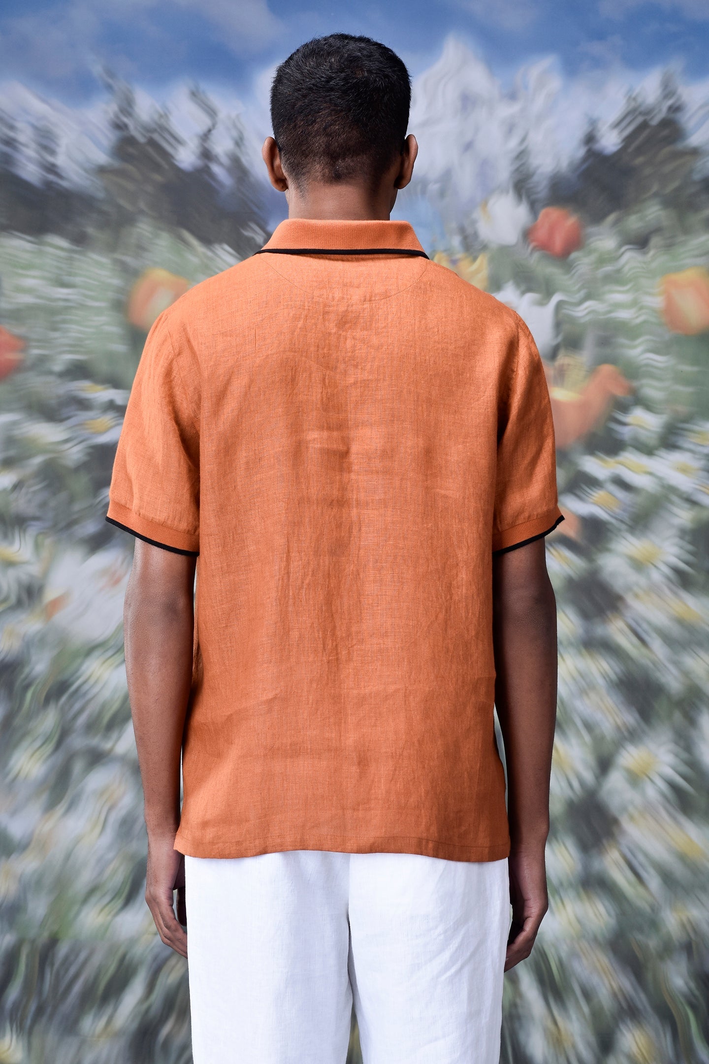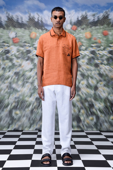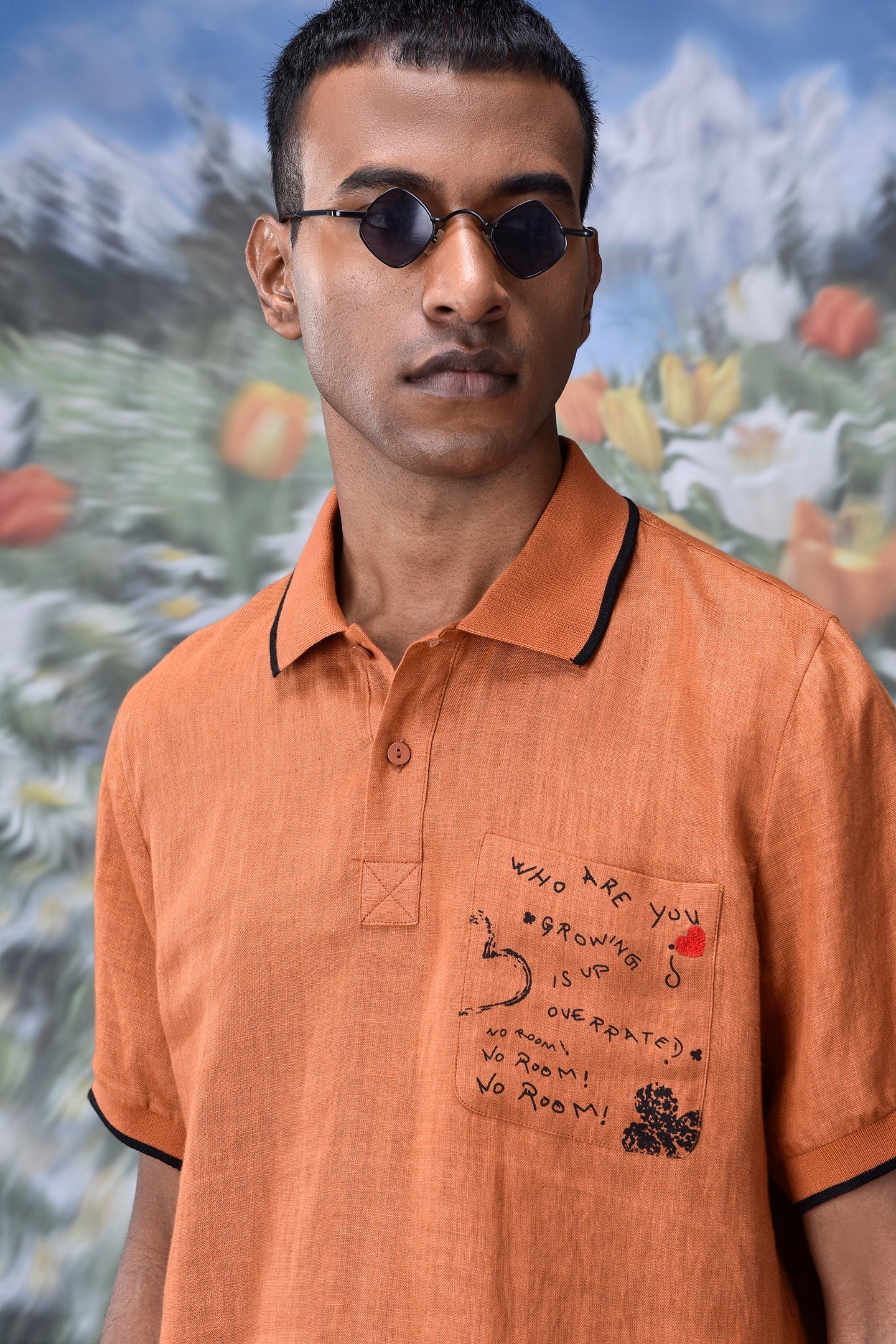 Presenting our Dark Caramel Linen Polo perfect blend of casual elegance and breathable comfort, with graffiti type print, evocating expression of joy with wisecrackers that add humor to everyday living.