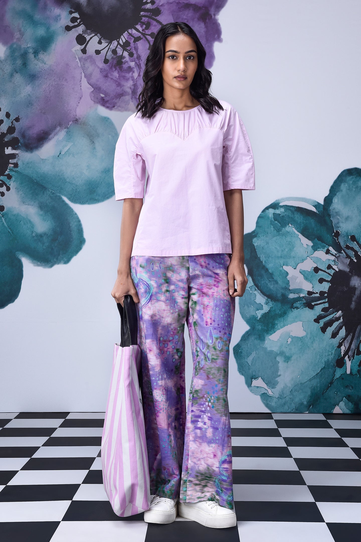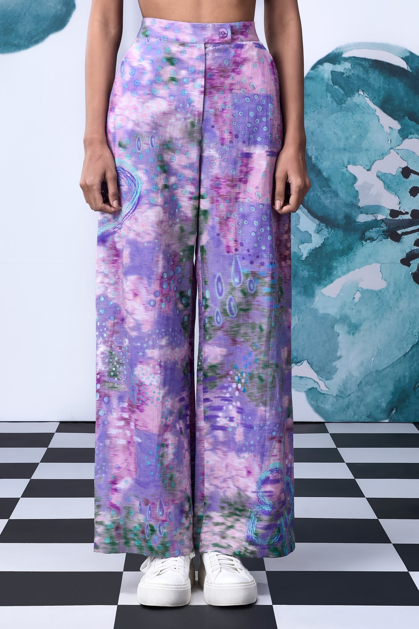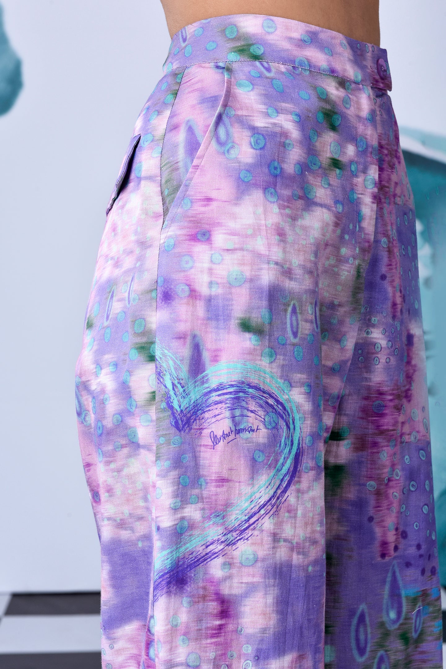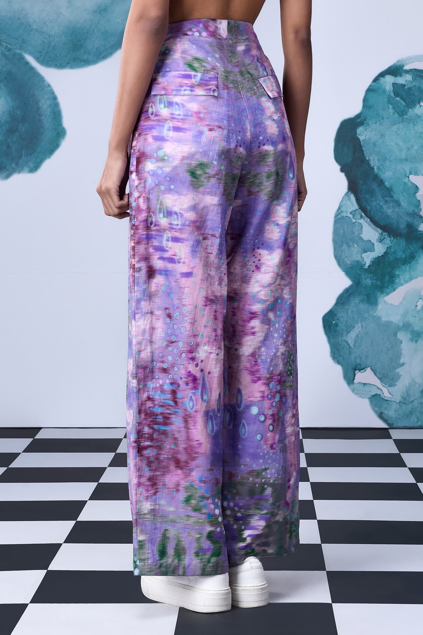Featuring Pool of Tear Trouser in French Lavender inspired by the chapter in Alice in Wonderland where Alice is overwhelmed by her size. The emotions have been interpreted through a layered digital artwork of a dreamscape submerged in tear drops. Iridescent coral and lavender hues breathe life into this aquatic artwork.
