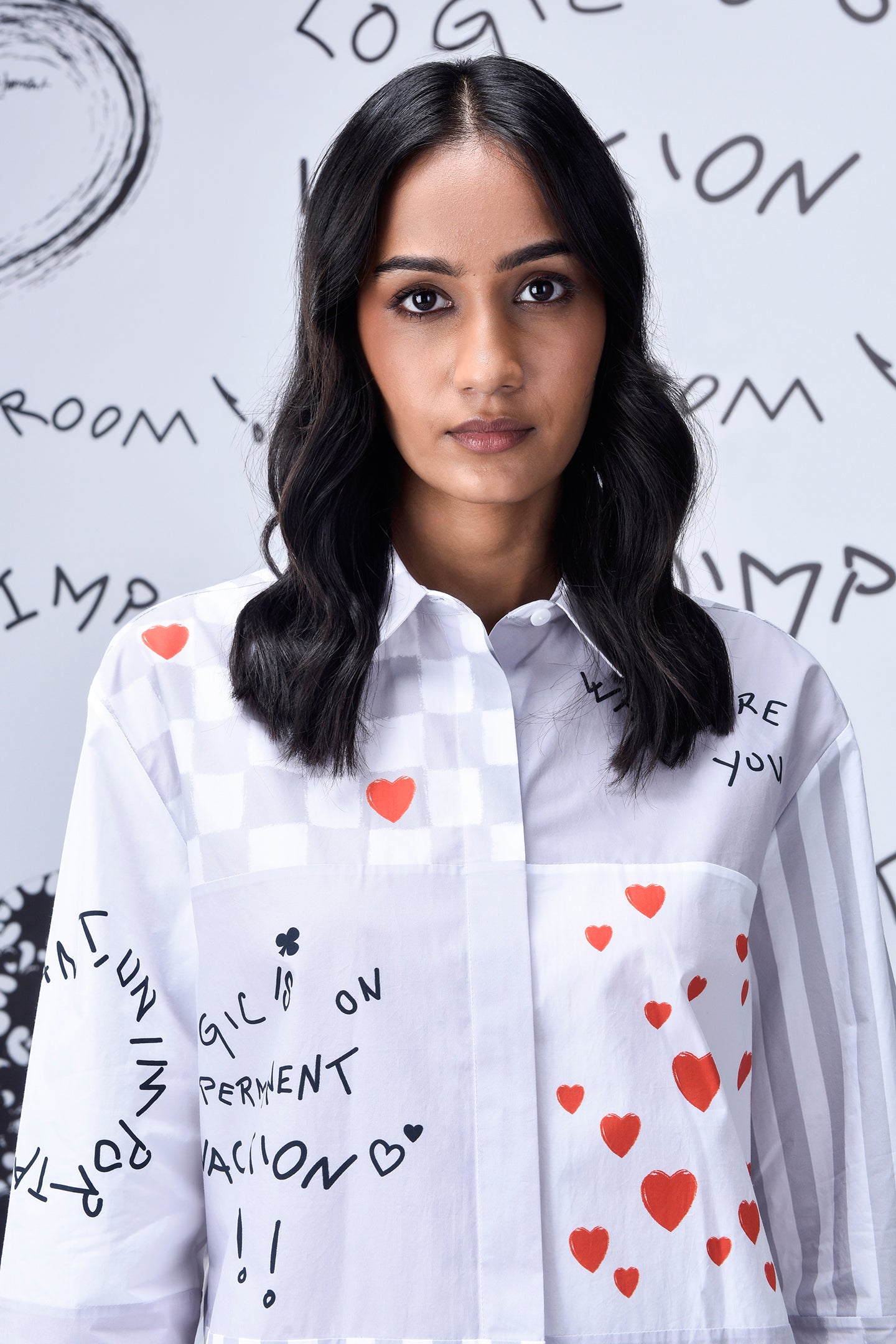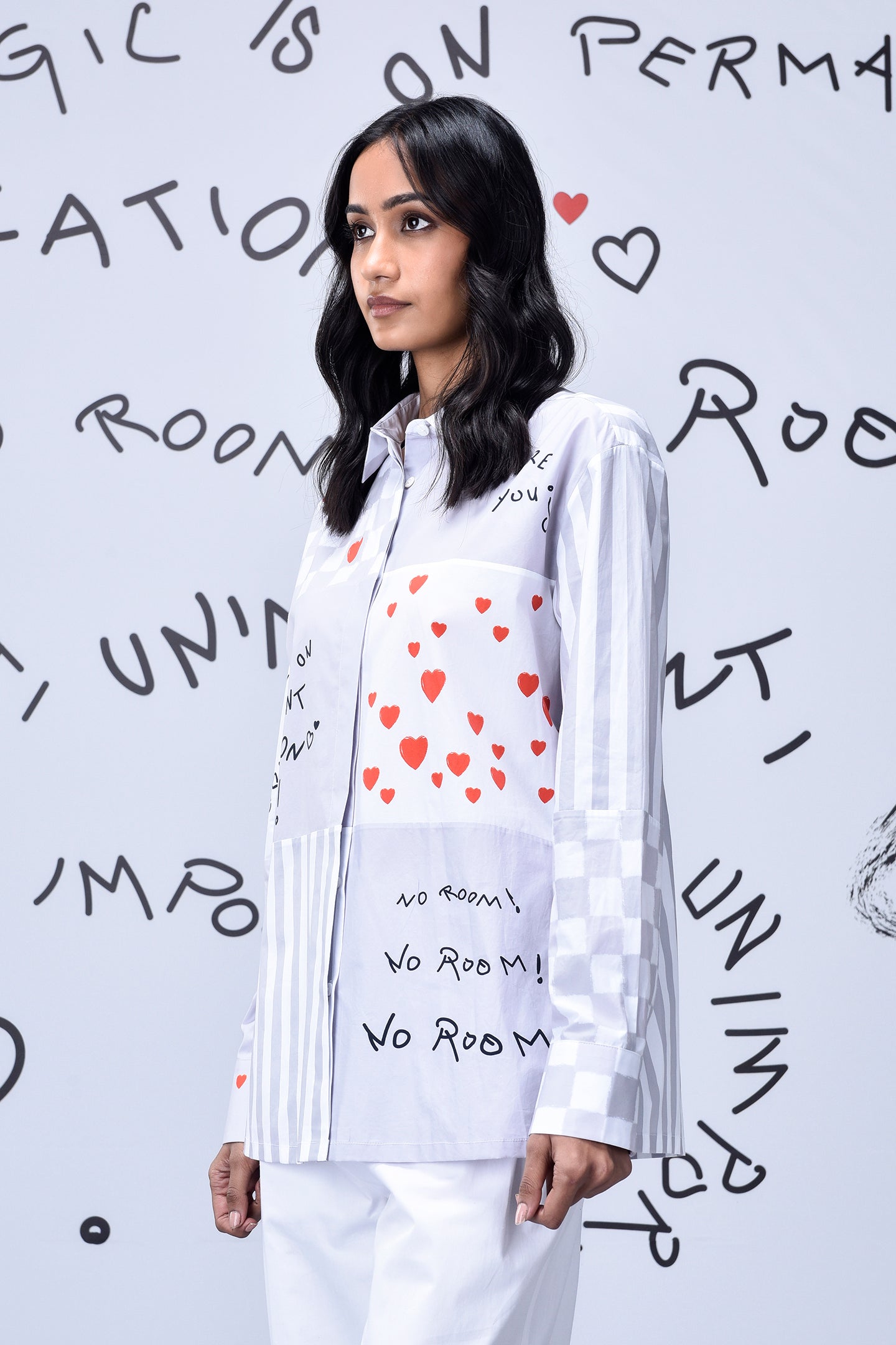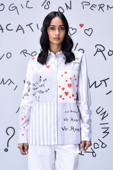 A modern twist to classic check print with our Women's Chess Board Shirt in Pearl Grey inspired by playful ‘fun and games’ spirits with Heart motifs and handwritten cheeky