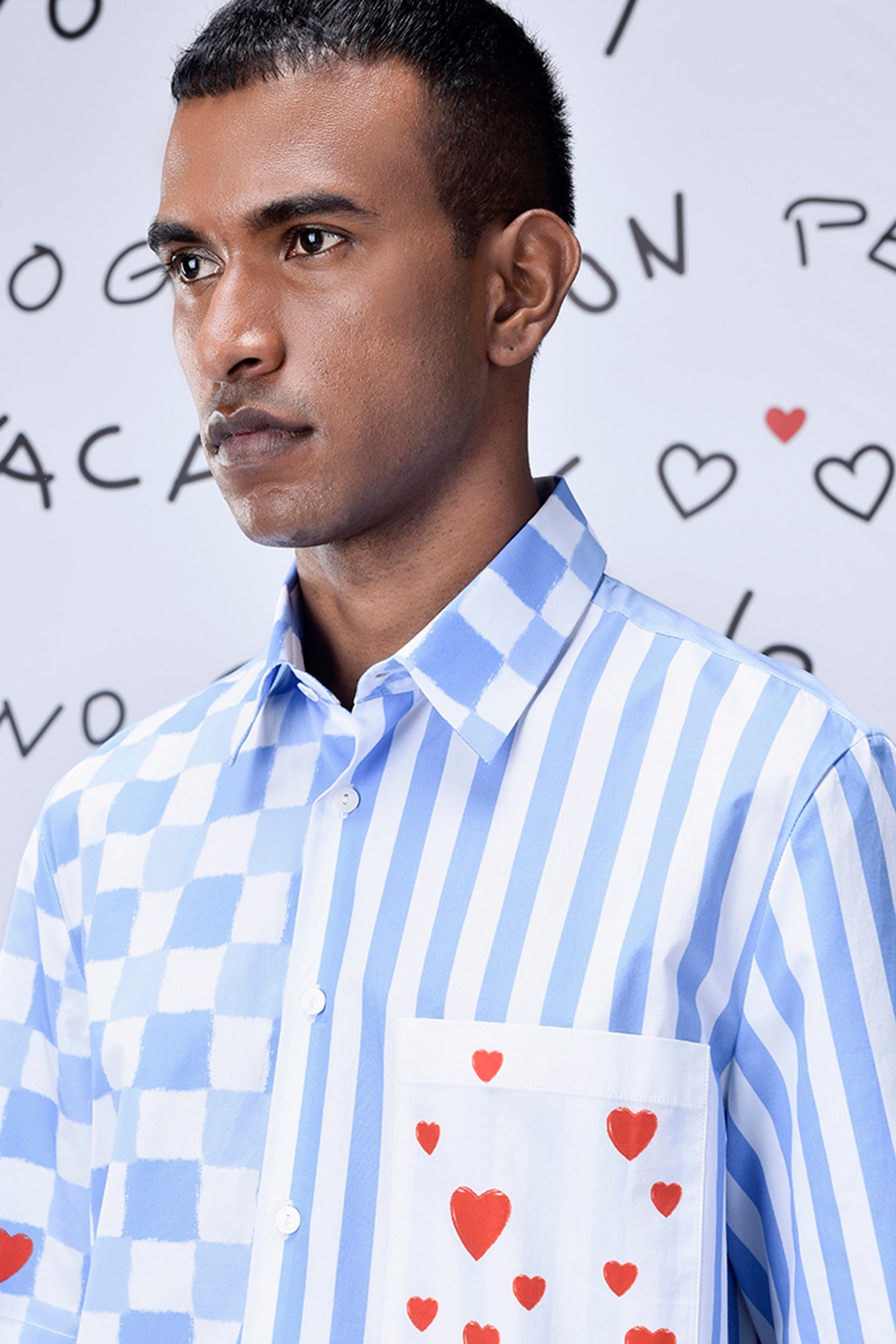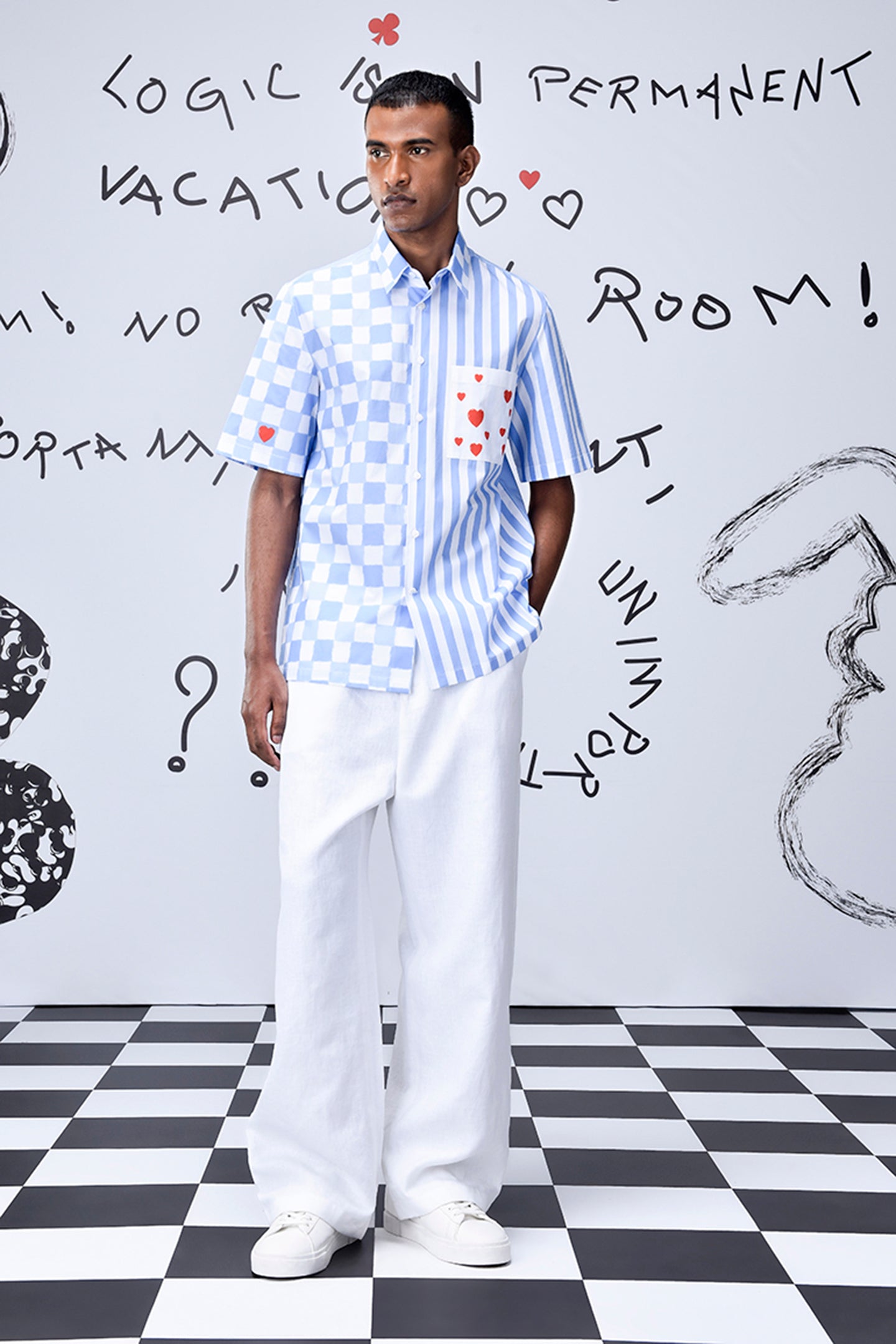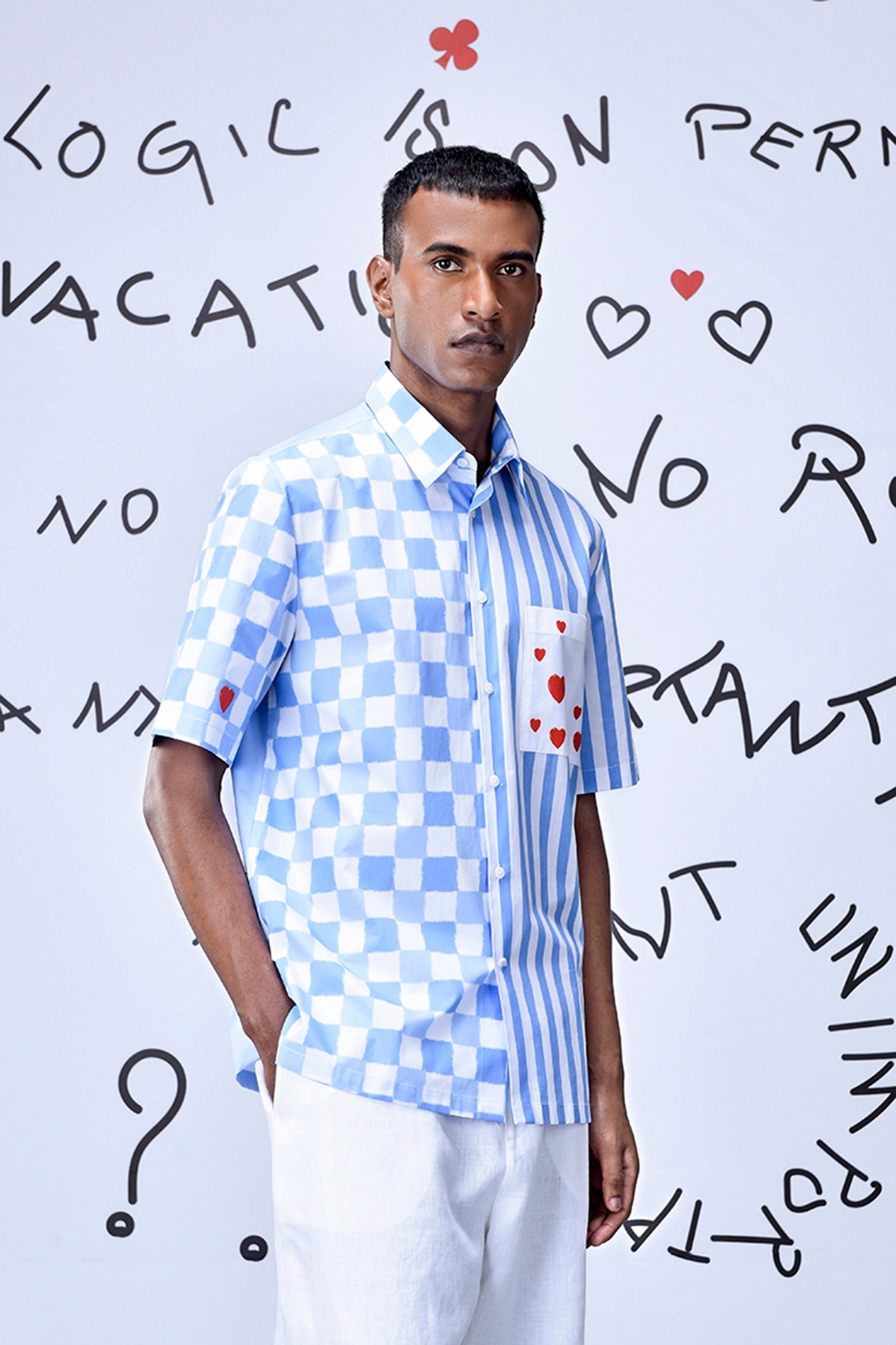 A modern twist to classic check print with our Chess Board Stripe Shirt inspired by playful ‘fun and games’ spirits with Heart motifs and handwritten cheeky quotes adds an element of quirk.