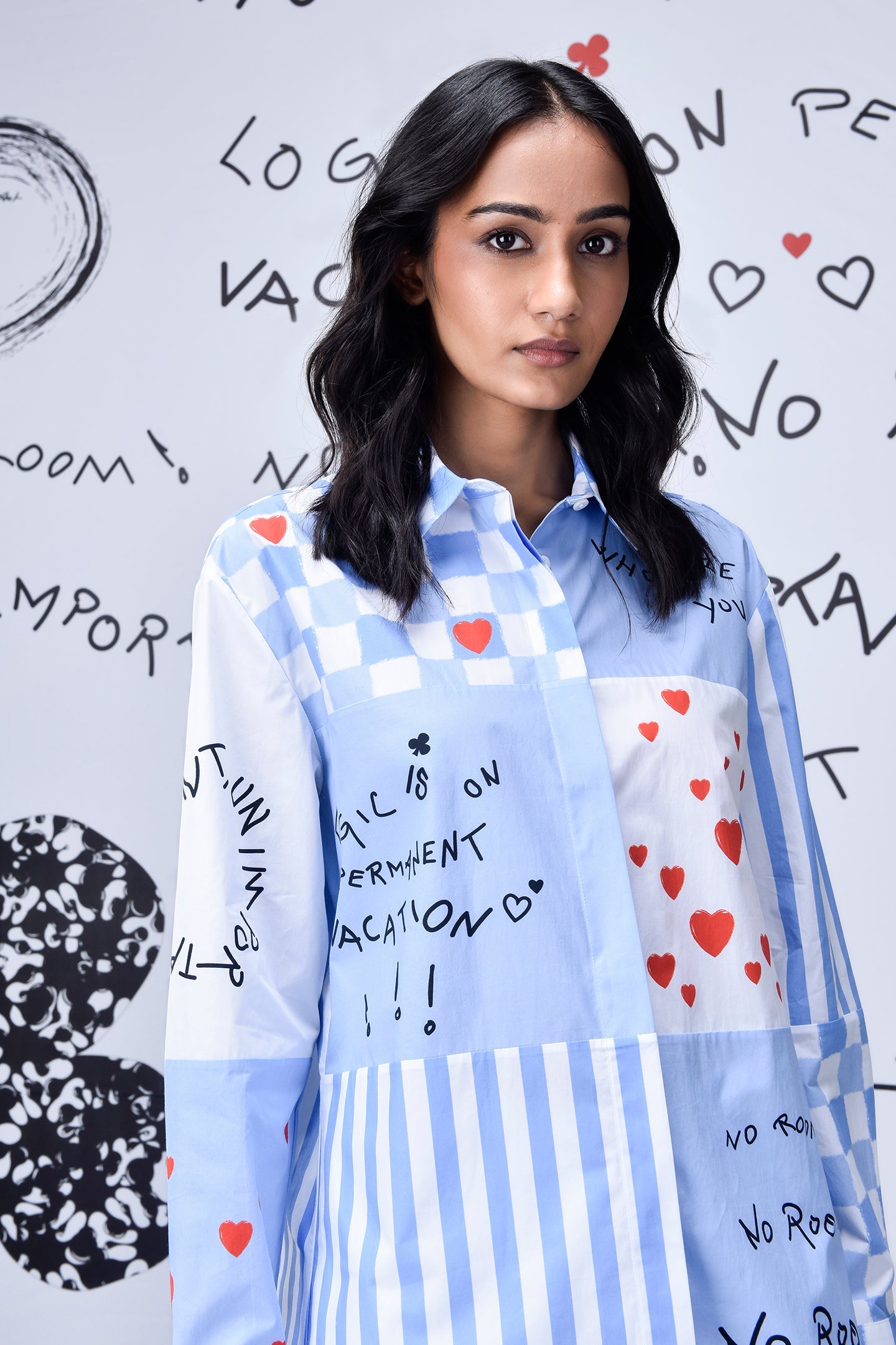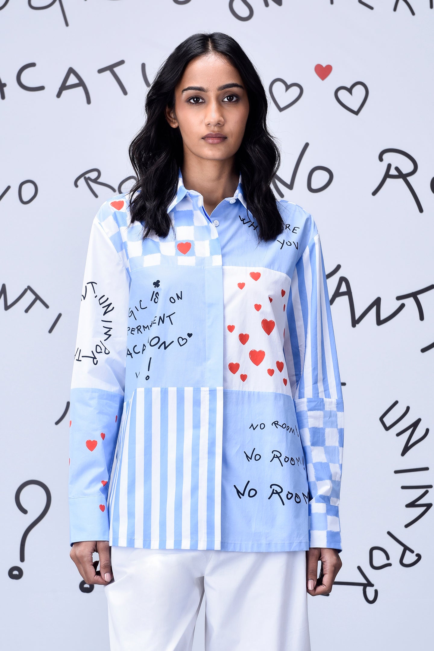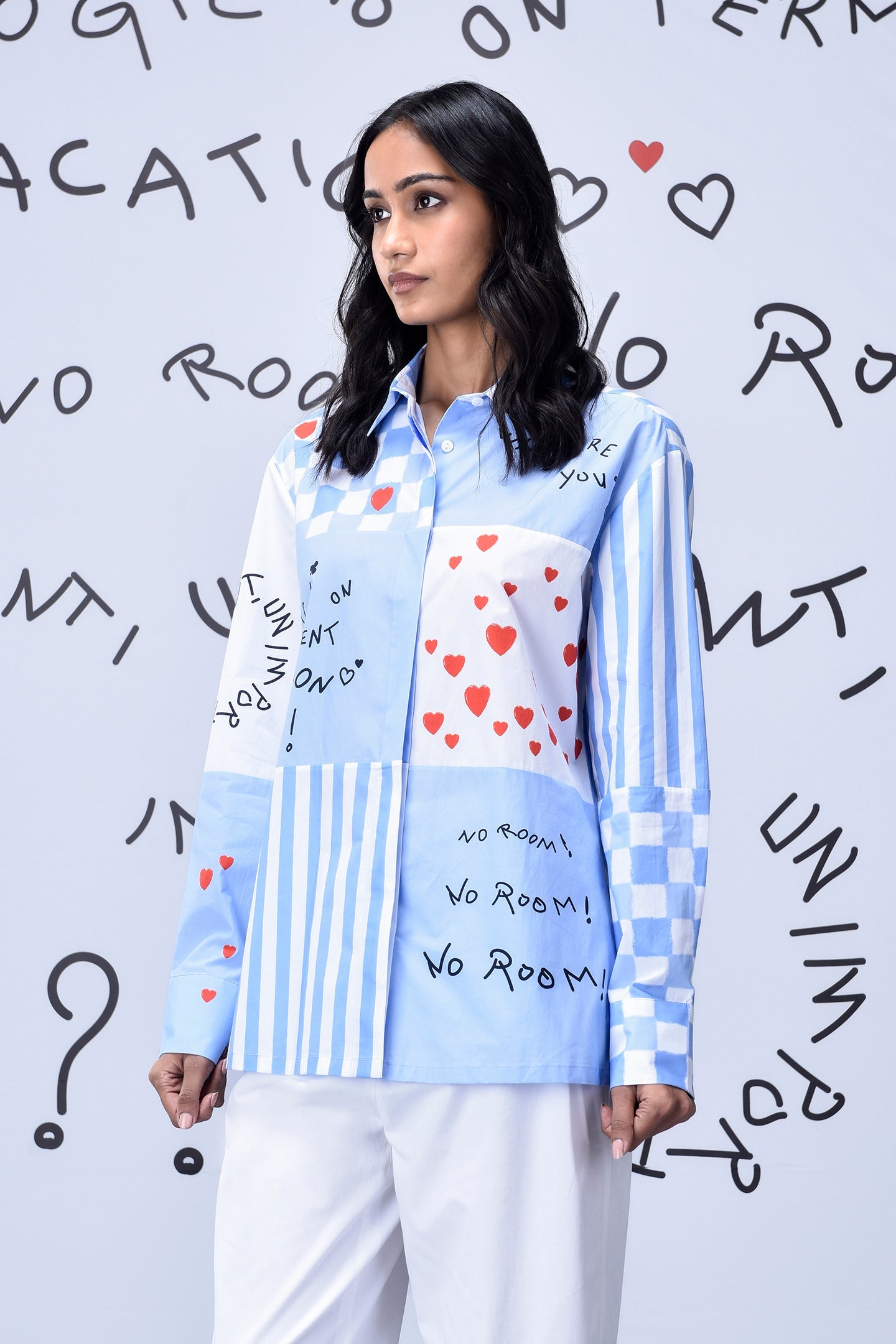 A modern twist to classic check print with our Women's Chess Board Shirt in Light Blue inspired by playful ‘fun and games’ spirits with Heart motifs and handwritten cheeky