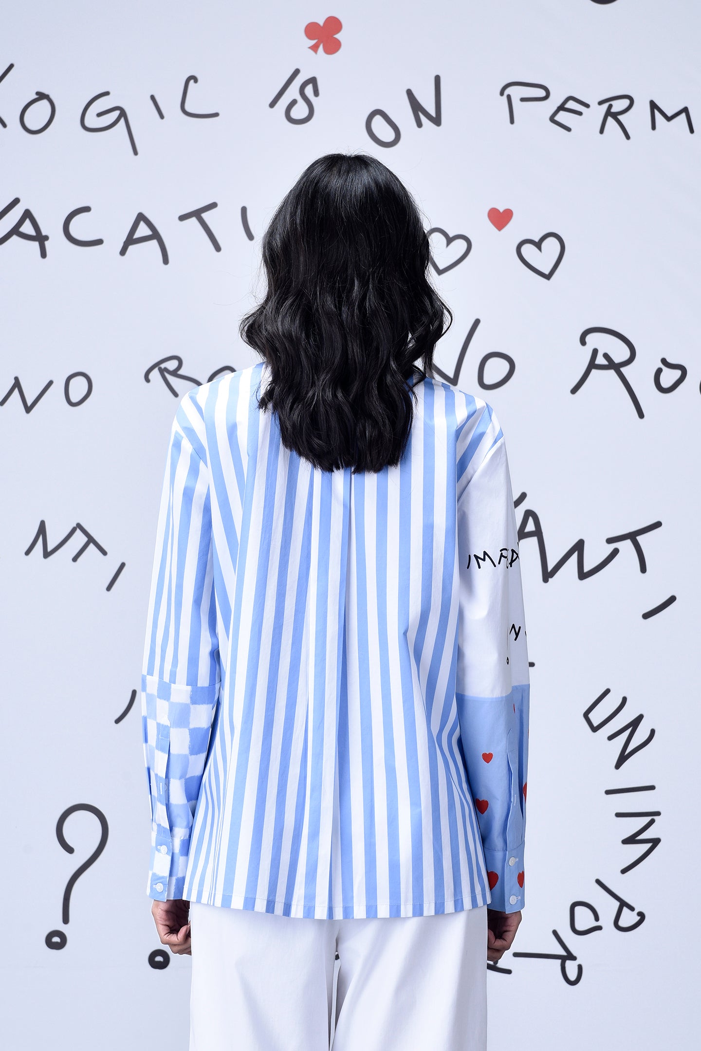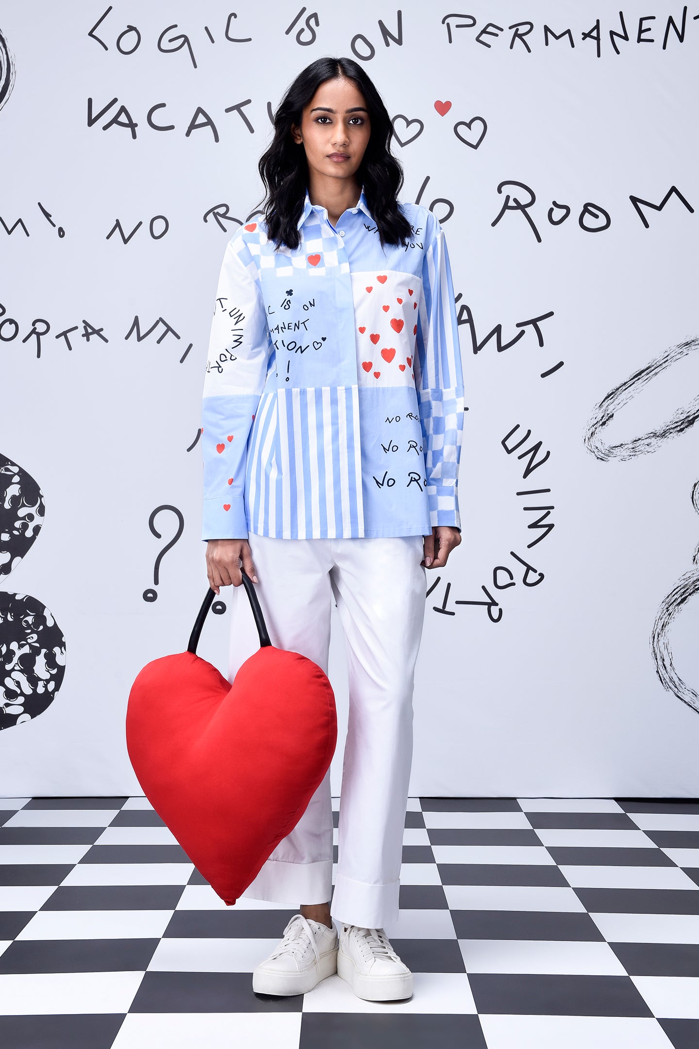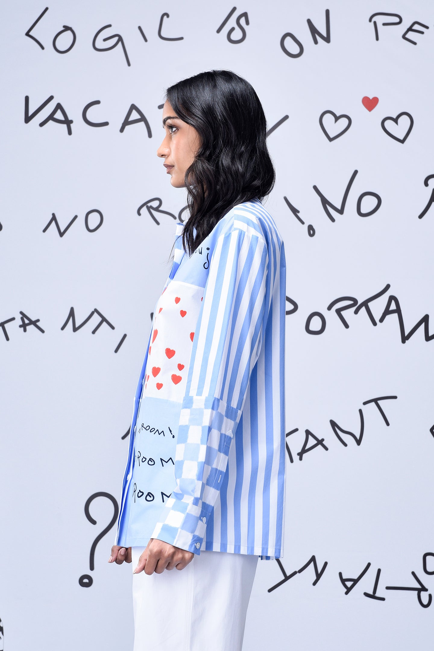 A modern twist to classic check print with our Women's Chess Board Shirt in Light Blue inspired by playful ‘fun and games’ spirits with Heart motifs and handwritten cheeky