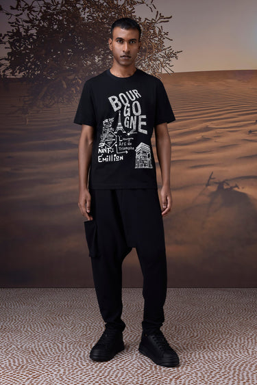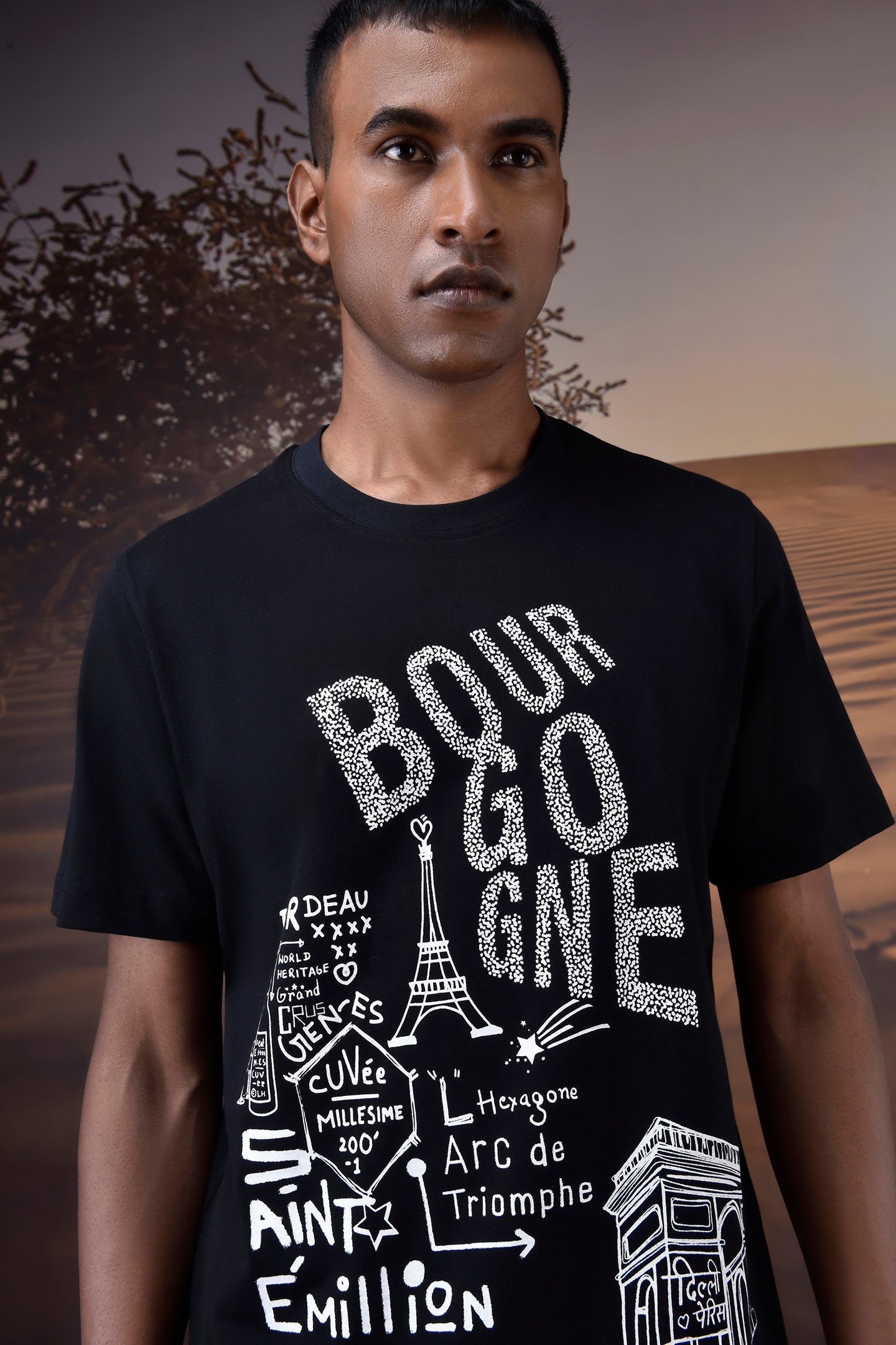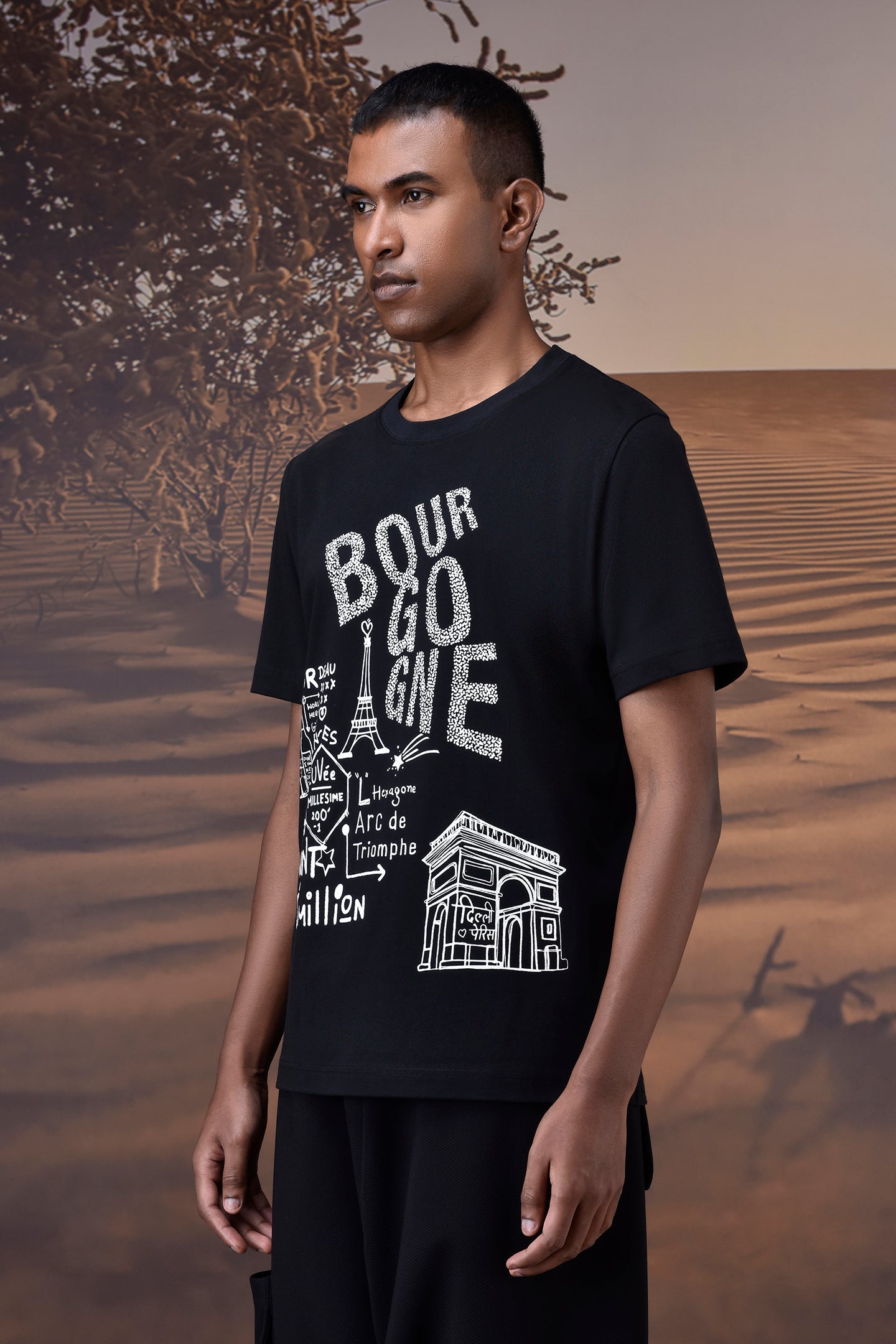 Bold and graphic, this men’s t-shirt in black brings a fresh perspective to everyday dressing. Made from soft single cotton jersey, it features a sketched map-style graphic inspired by iconic French landmarks — from Bordeaux to the Eiffel Tower.