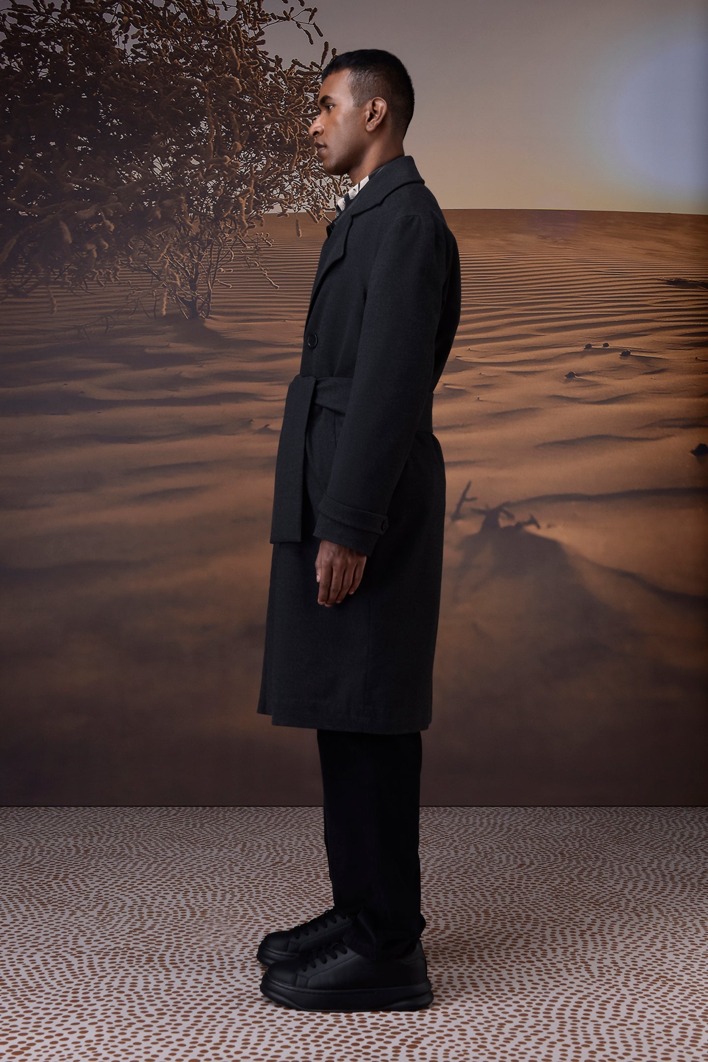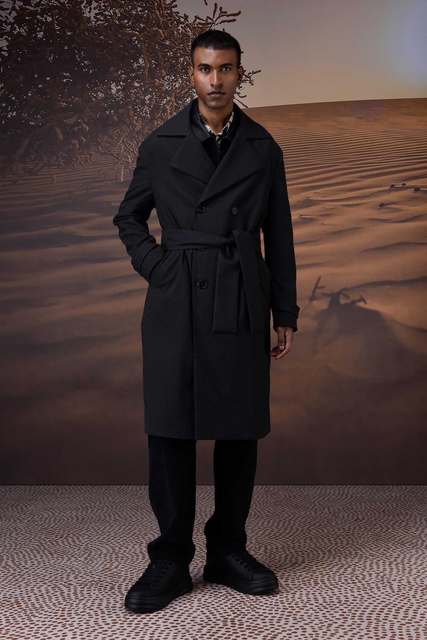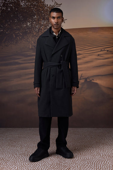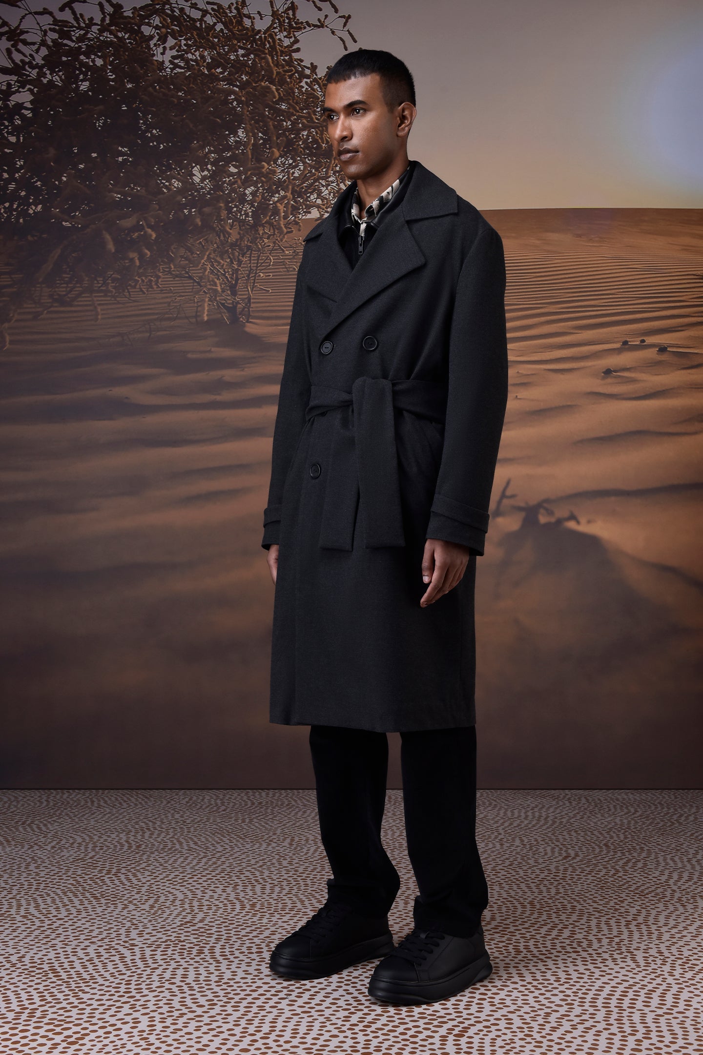 Expertly cut from structured poly felt, this charcoal trench coat delivers classic sophistication updated with a contemporary edge. The midweight felt fabric offers smooth surface texture and warmth while retaining a tailored silhouette. Designed with a broad notched lapel, double-breasted button closure, and a coordinating self-belt, the coat balances timeless trench detailing with modern utility. Practical side pockets and full-length sleeves round out the streamlined look, making it an essential outer layer for polished city style.