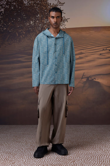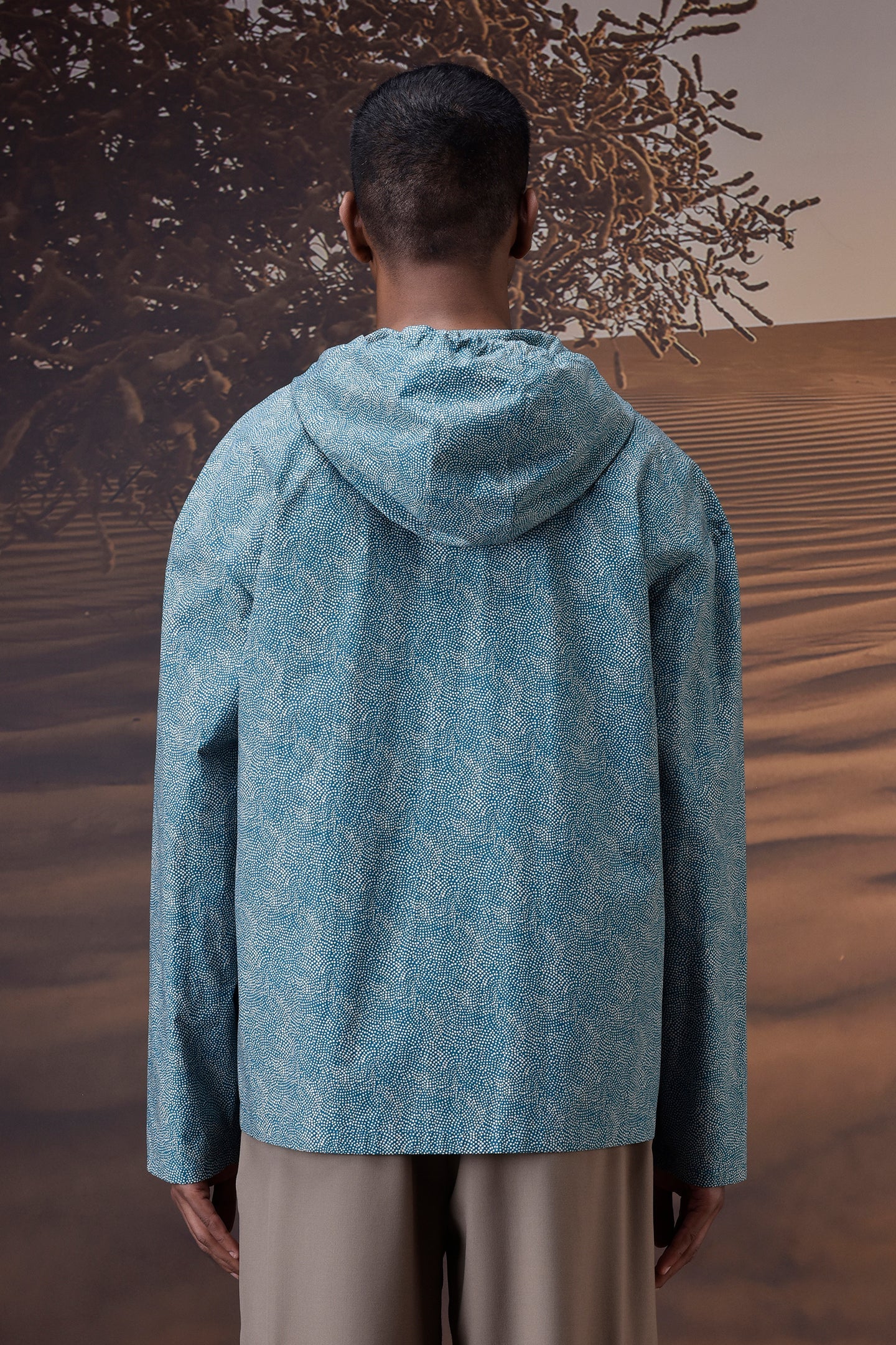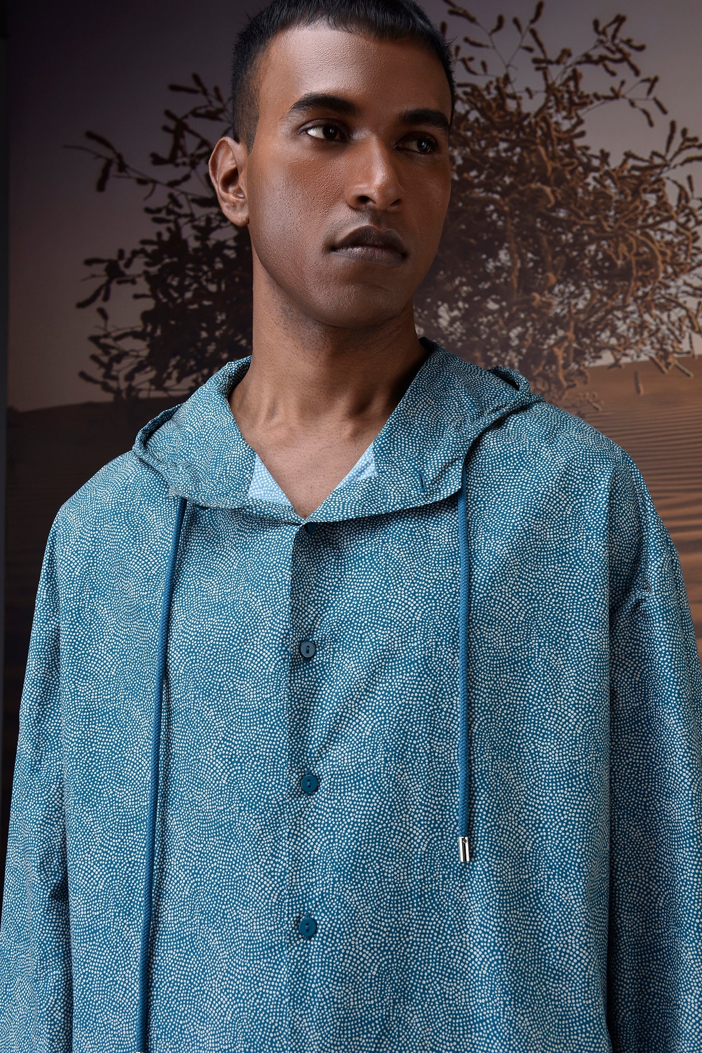 Crafted from premium Giza cotton poplin, this hooded shirt reimagines casual dressing with a refined ease. Its retro blue base is enlivened by a micro-dotted pattern, lending texture and depth without overwhelming the silhouette. The relaxed cut is anchored by a neat button-down front and an attached drawstring hood, balancing tailored structure with laid-back appeal.