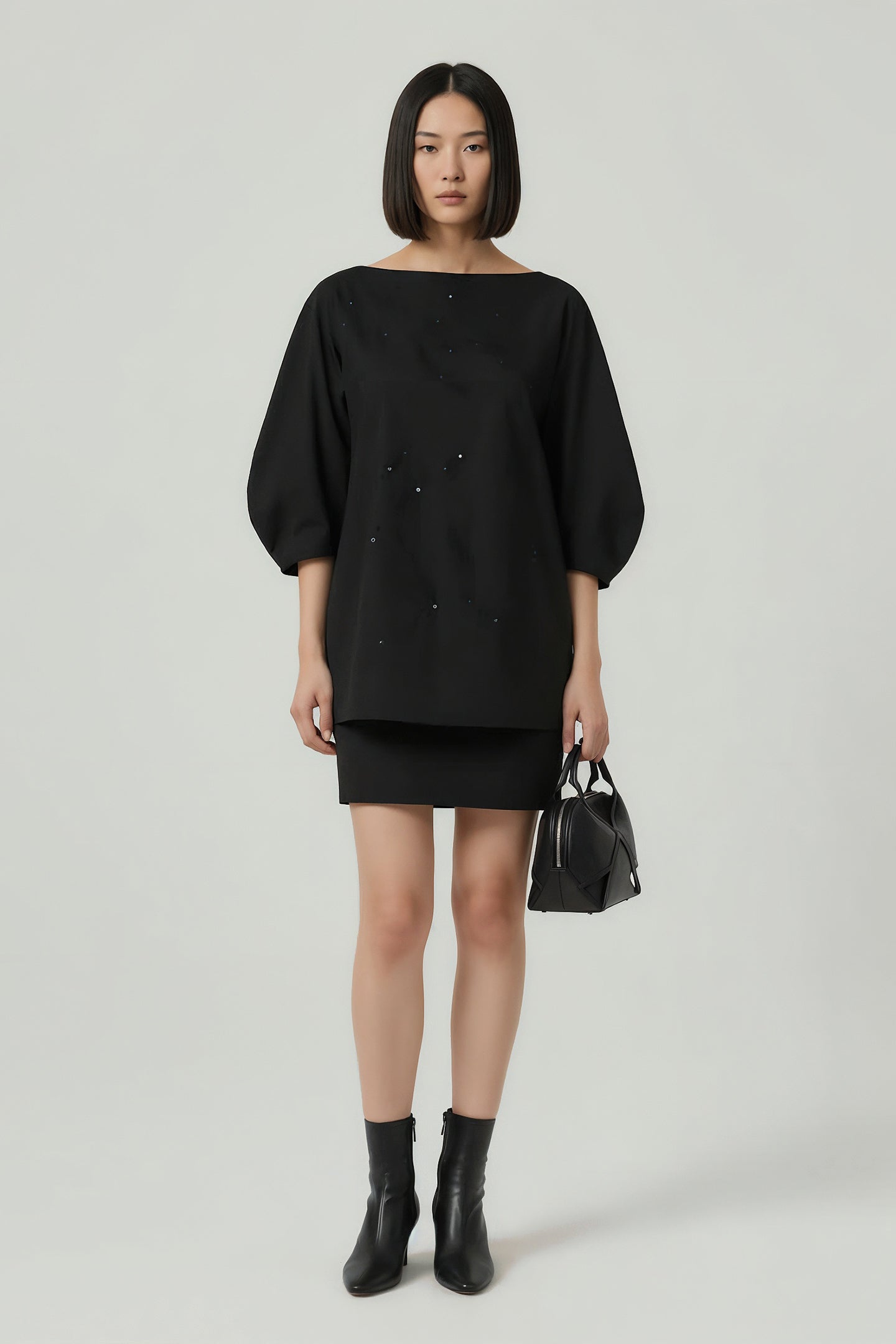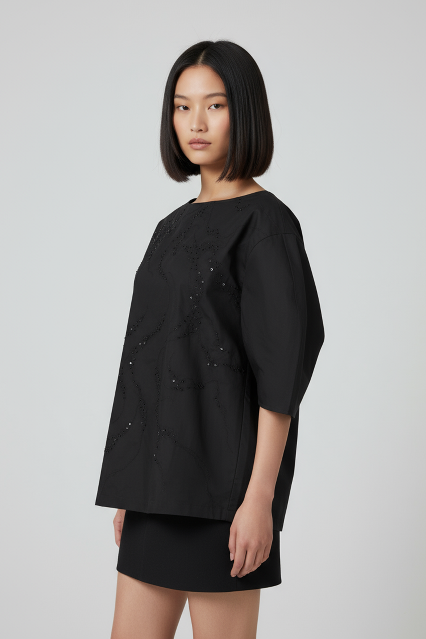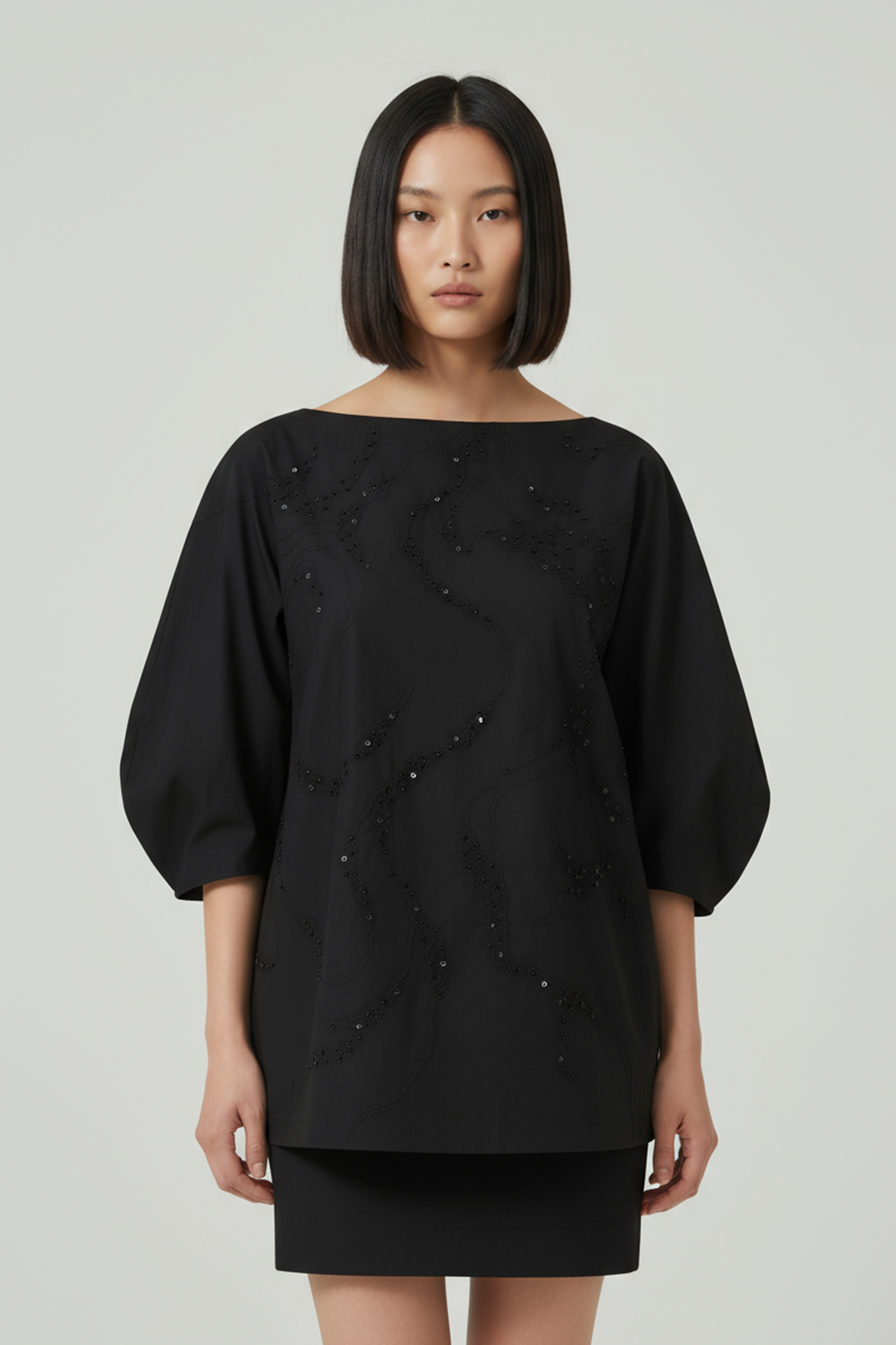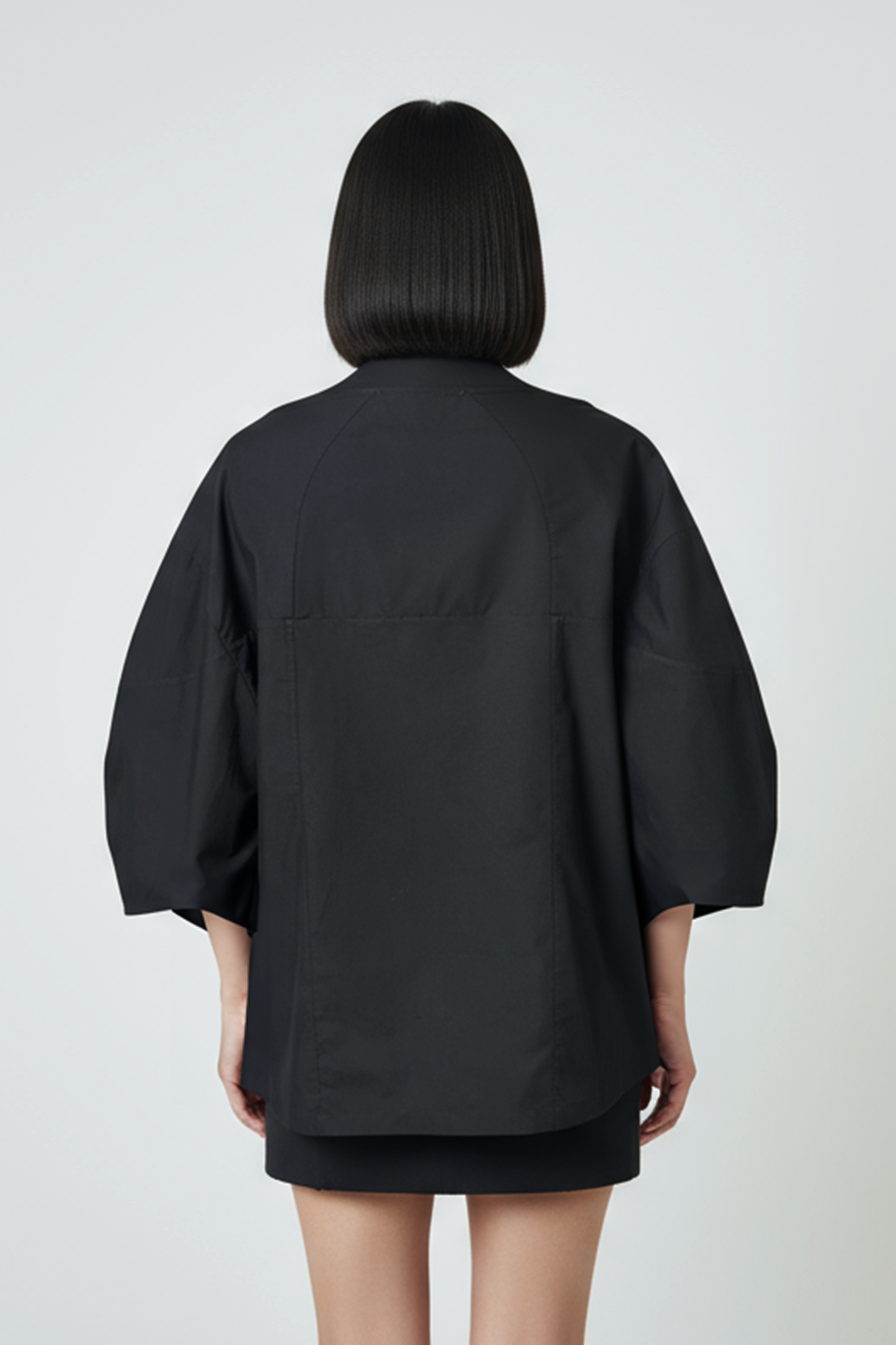 Crafted from 100 % Giza Cotton Poplin, this top captures the essence of modern minimalism and refined craftsmanship. The fabric’s crisp structure and natural sheen create a fluid yet sculpted silhouette that moves gracefully with the wearer.