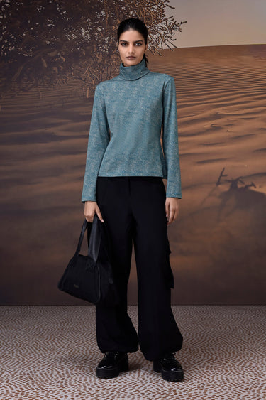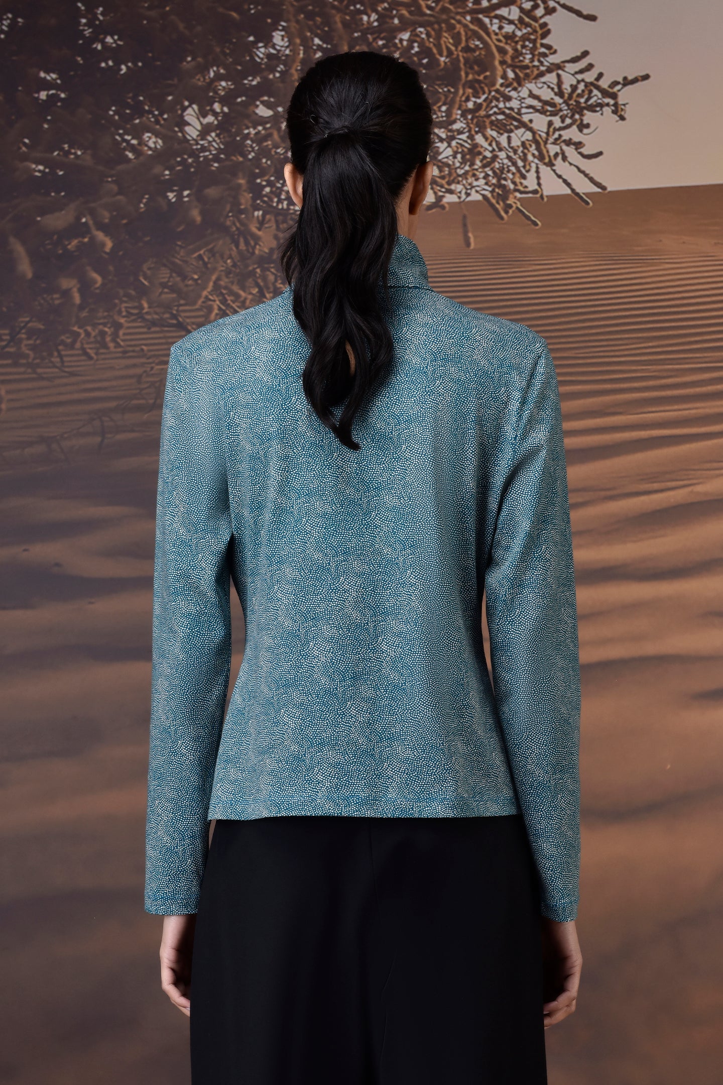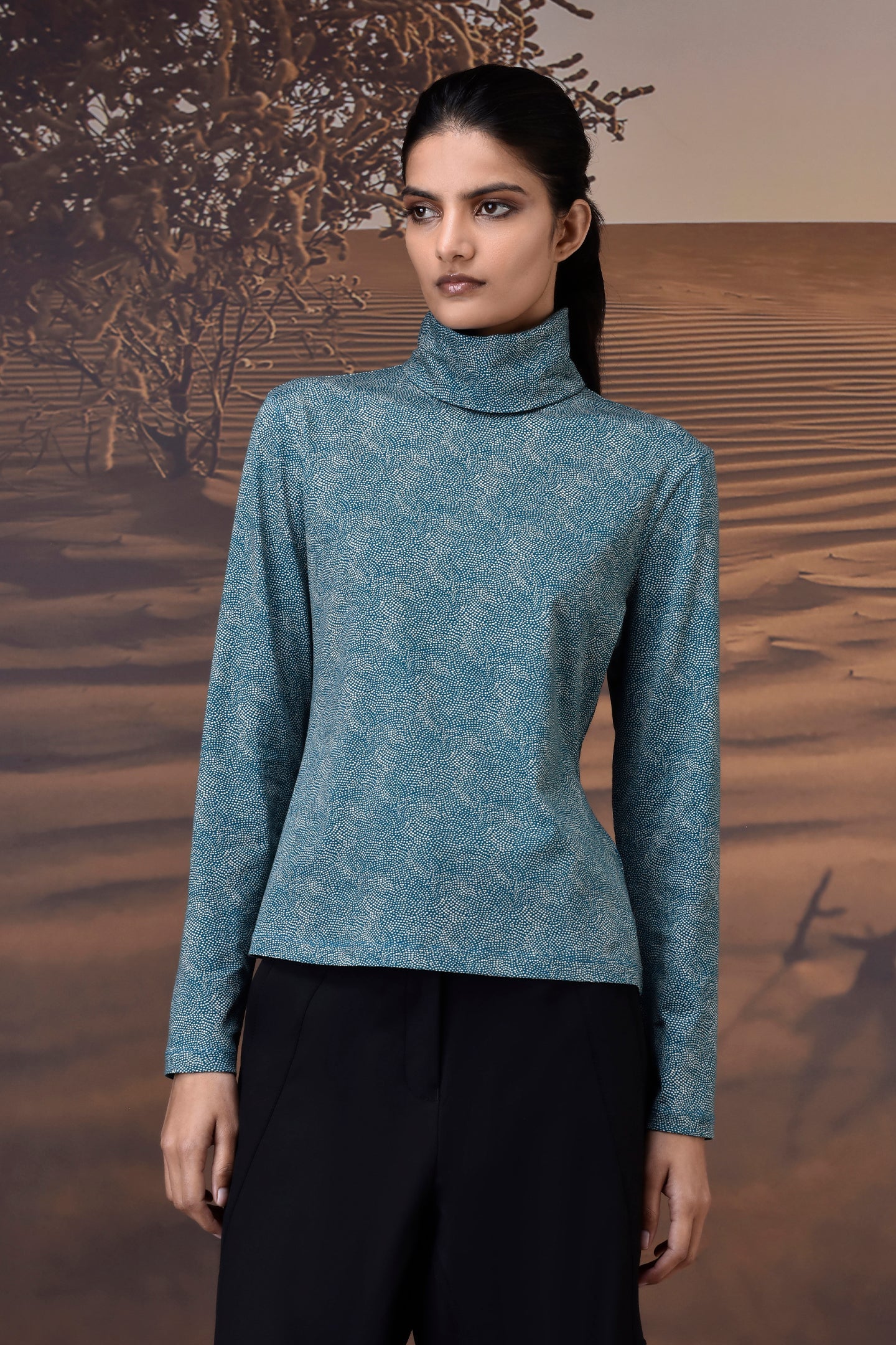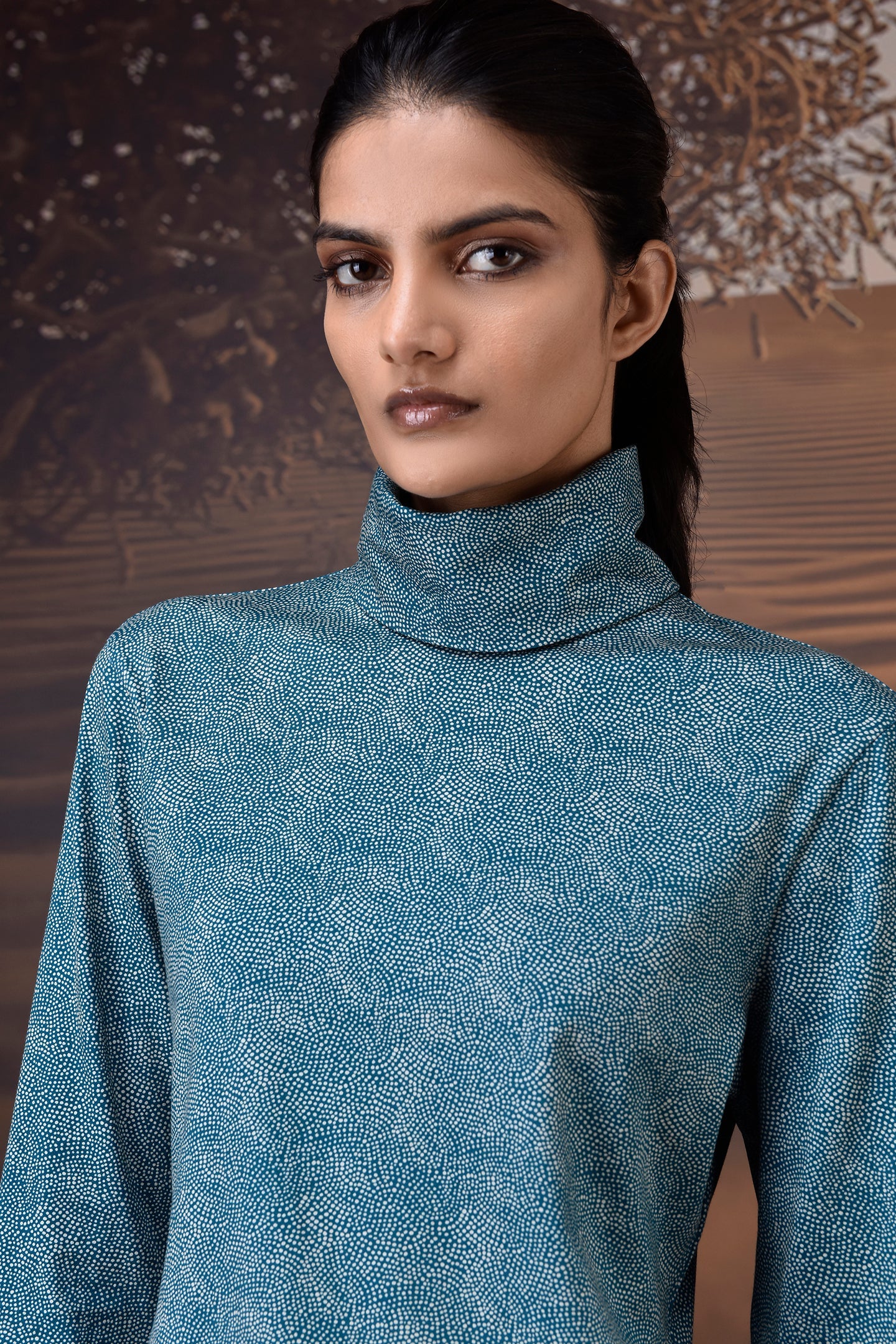 Crafted from premium cotton single jersey, this retro blue high-neck top is elevated with a subtle micro-dot pattern for a refined, modern touch. Its soft yet structured fabric ensures all-day comfort, while the sleek silhouette makes it a versatile piece for both casual and elevated styling. The back button closure adds a hint of detailing while keeping the design minimal and chic.
