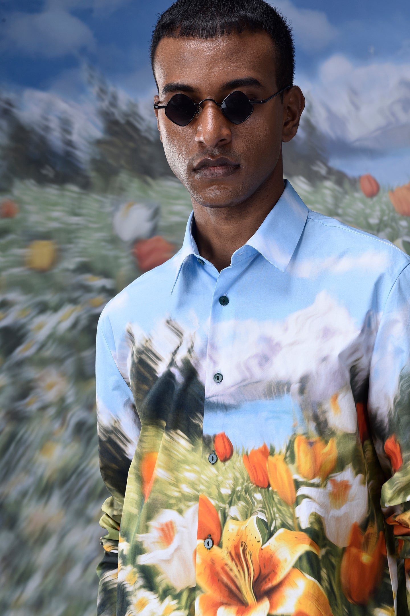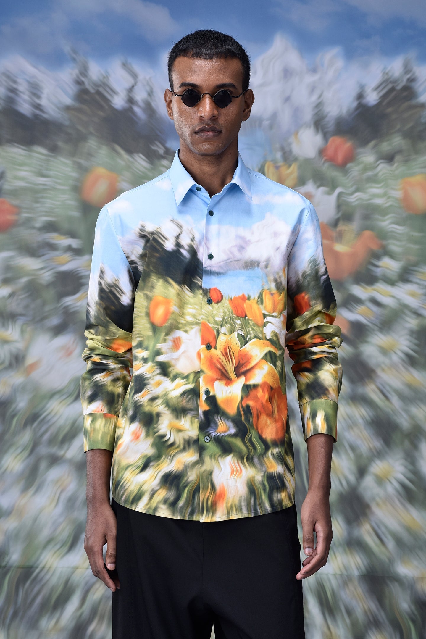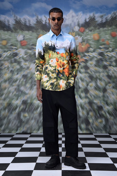 Elevate your wardrobe with our, Garden Print Poplin Shirt with tiger lilies, tulips and daises galore, with a heightened feeling of motion and blur, because as Didier Lecoanet quotes ,"A distorted garden print is like a moment stolen from a dream, vague and striking all at once.”