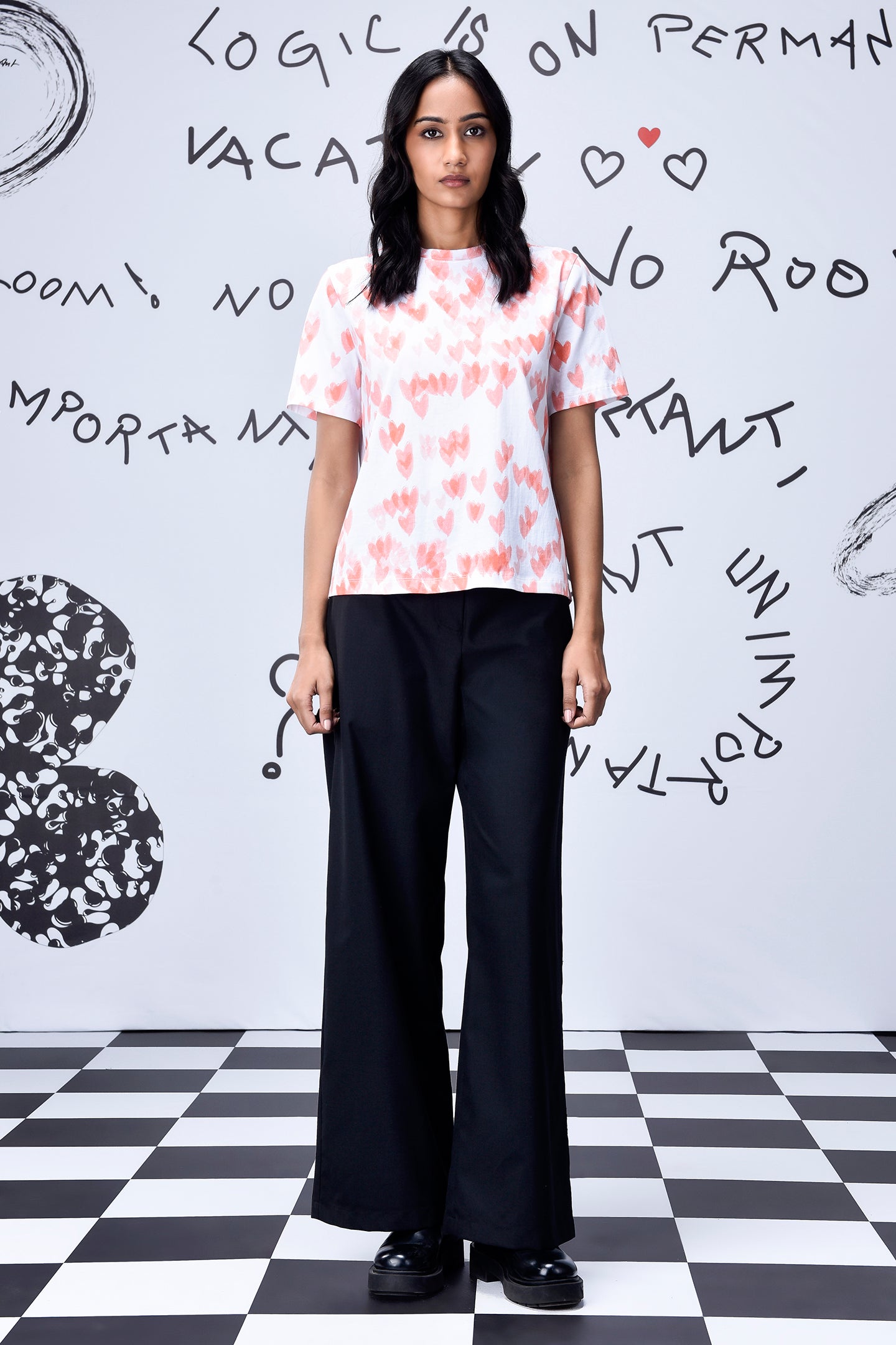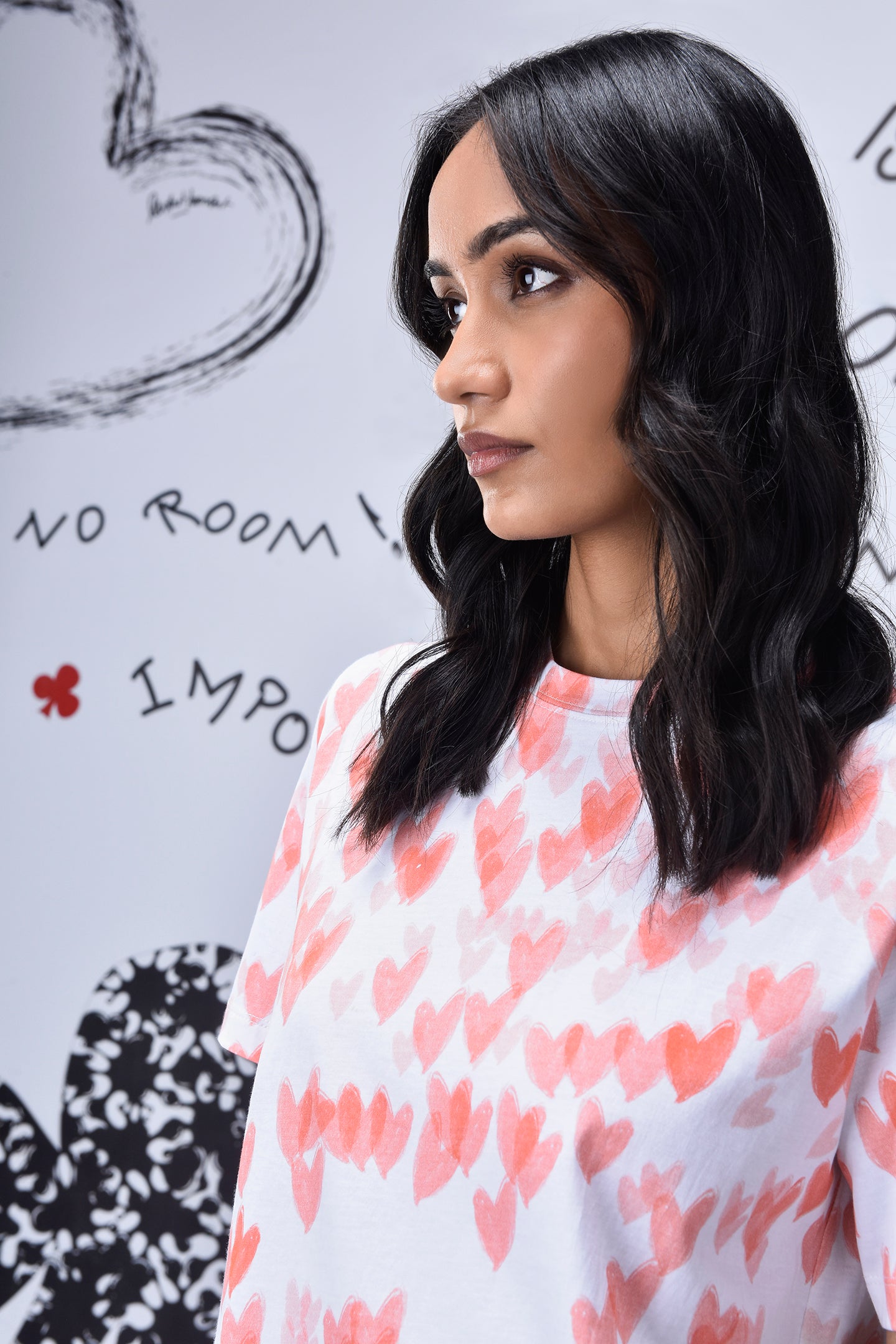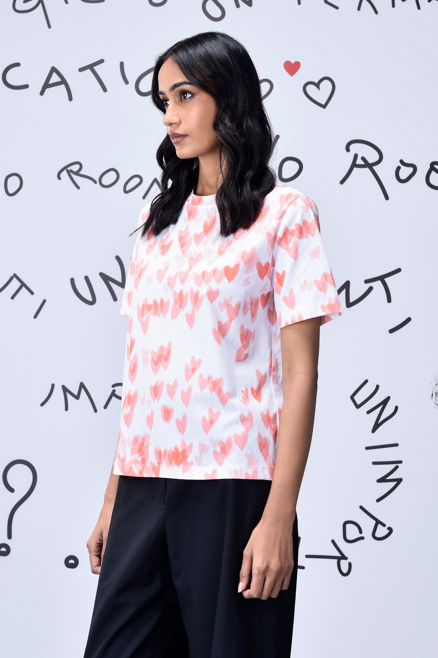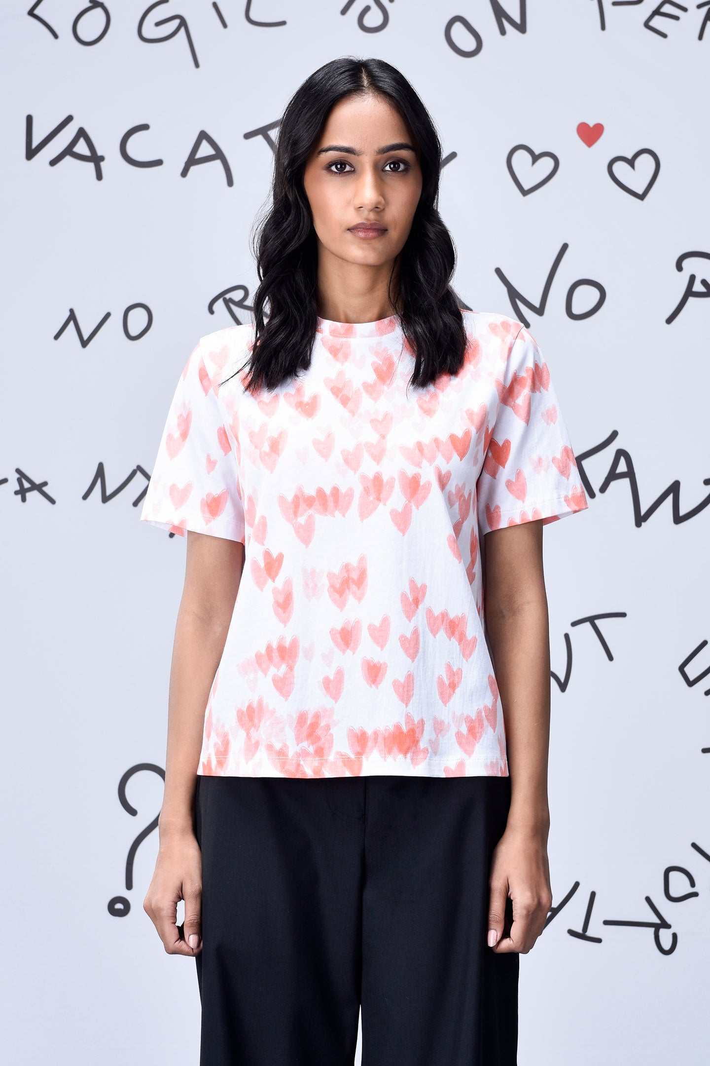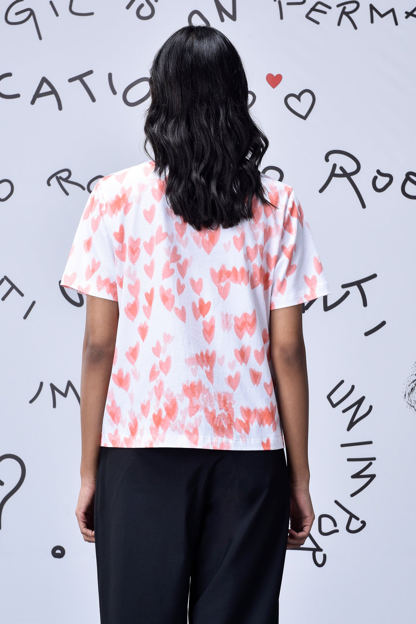 Coral Peach Cotton Single Jersey T-Shirt with Heart Motif Print