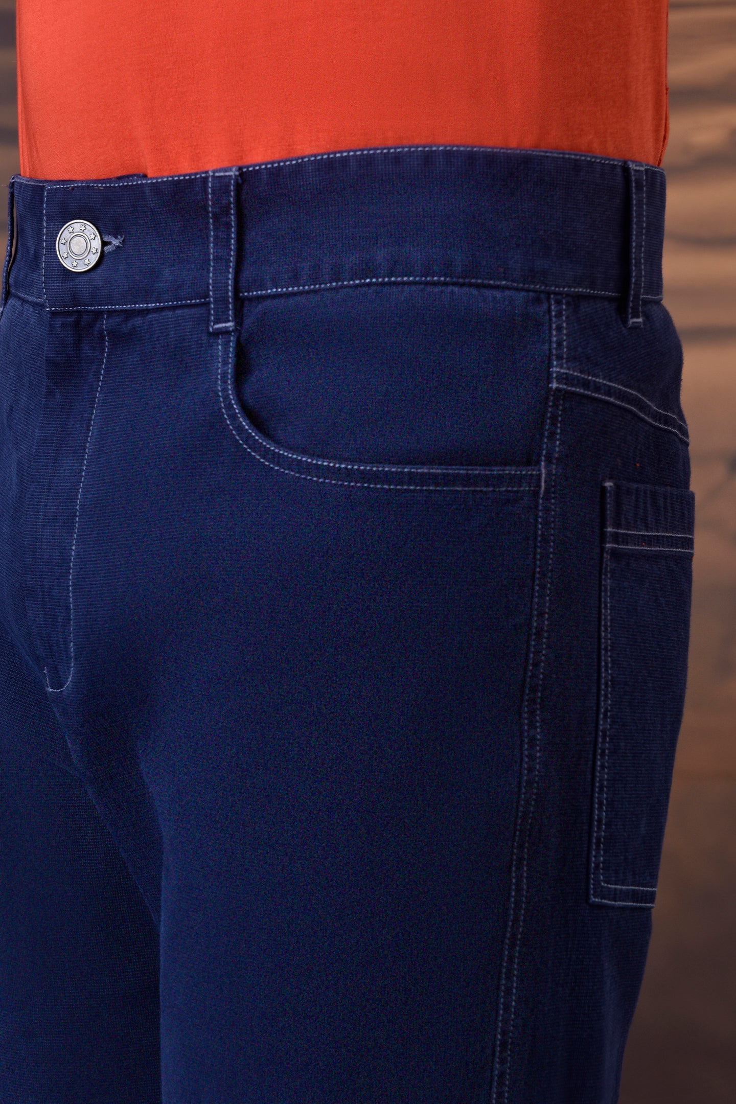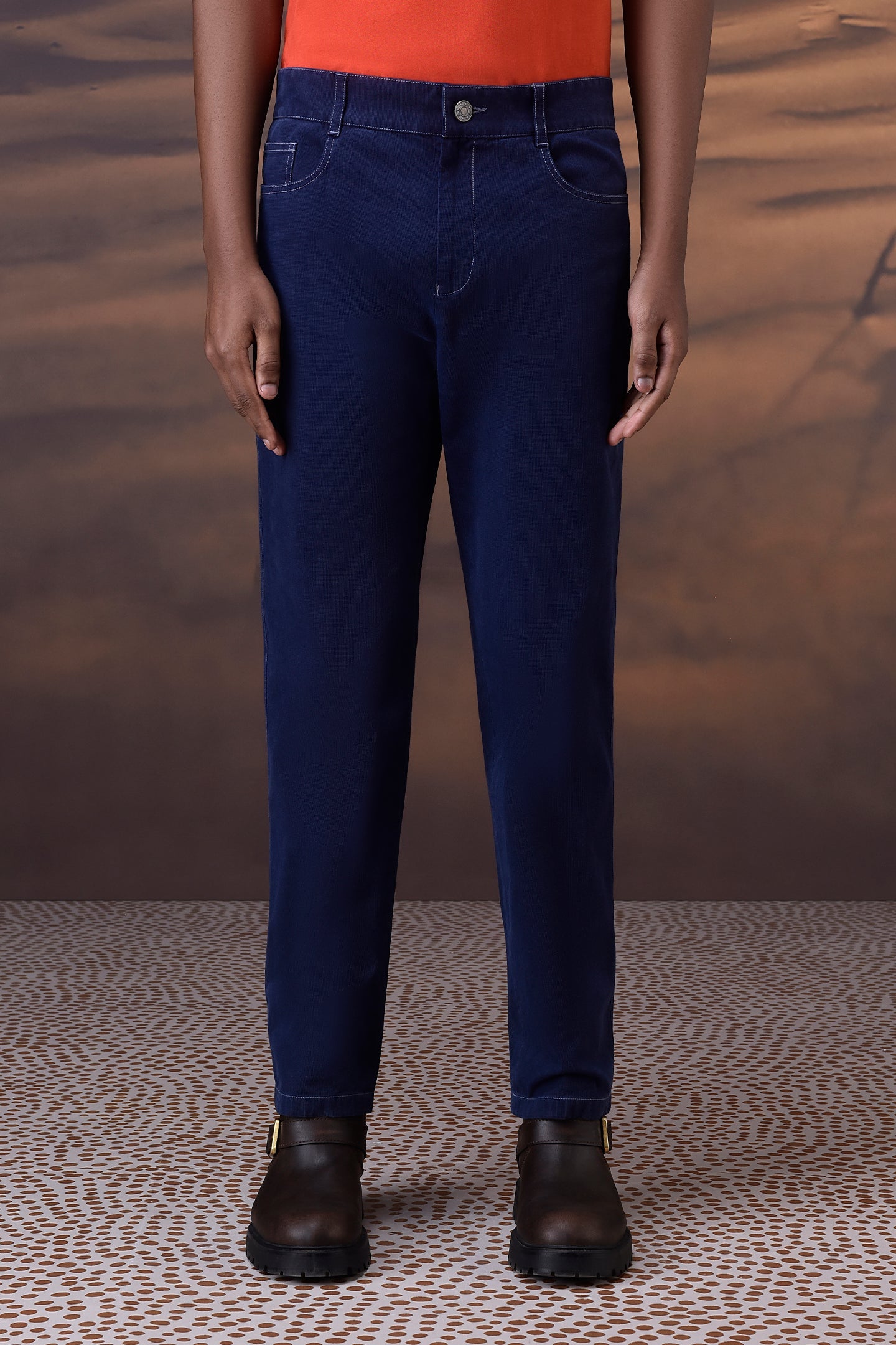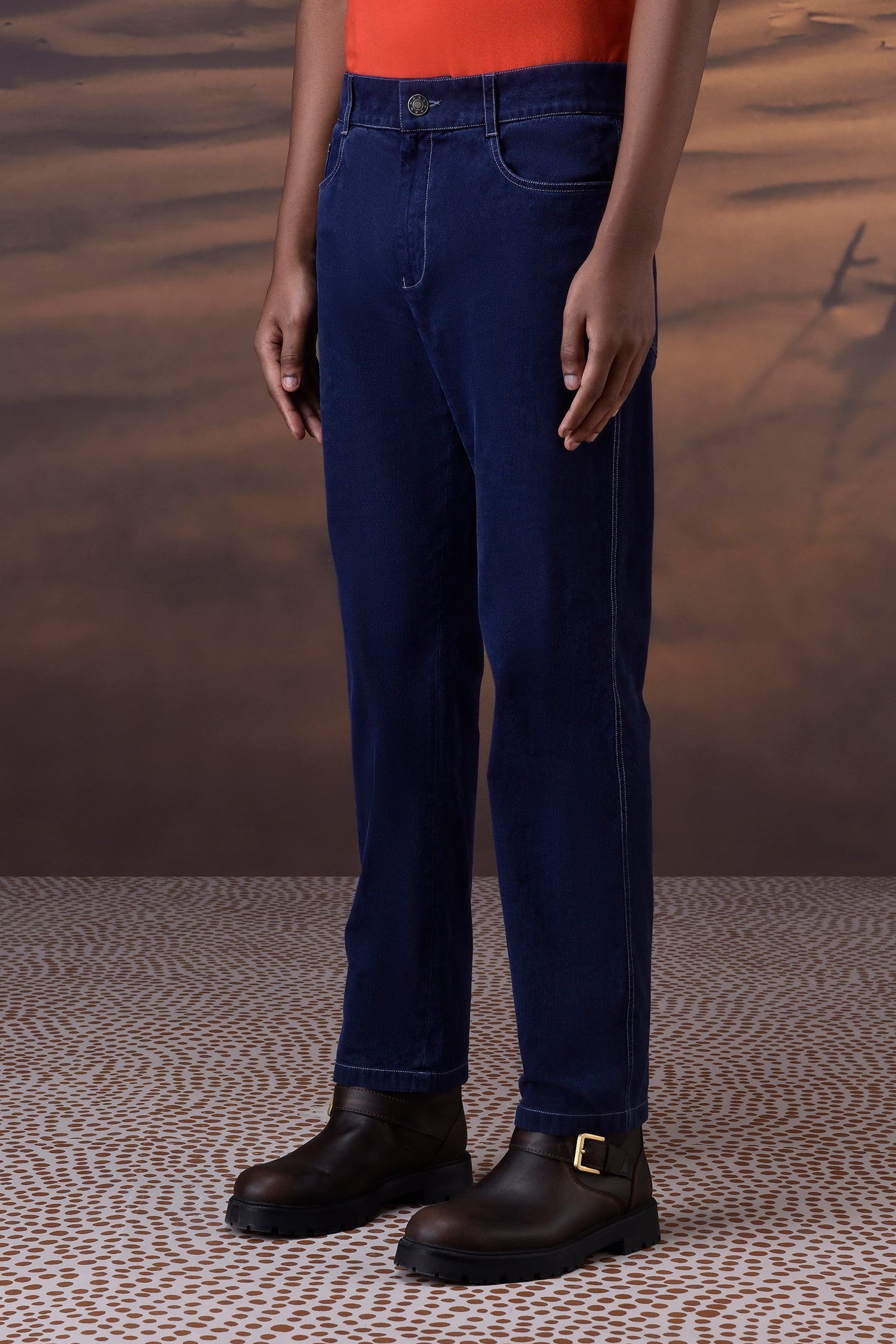 Tailored for everyday precision, these navy trousers are cut from structured cotton with a fine crosshatch texture. The fabric holds a clean line while remaining breathable and comfortable through long wear. A mid-rise waist and straight leg create a timeless profile that pairs seamlessly with shirts, tees, or lightweight jackets.