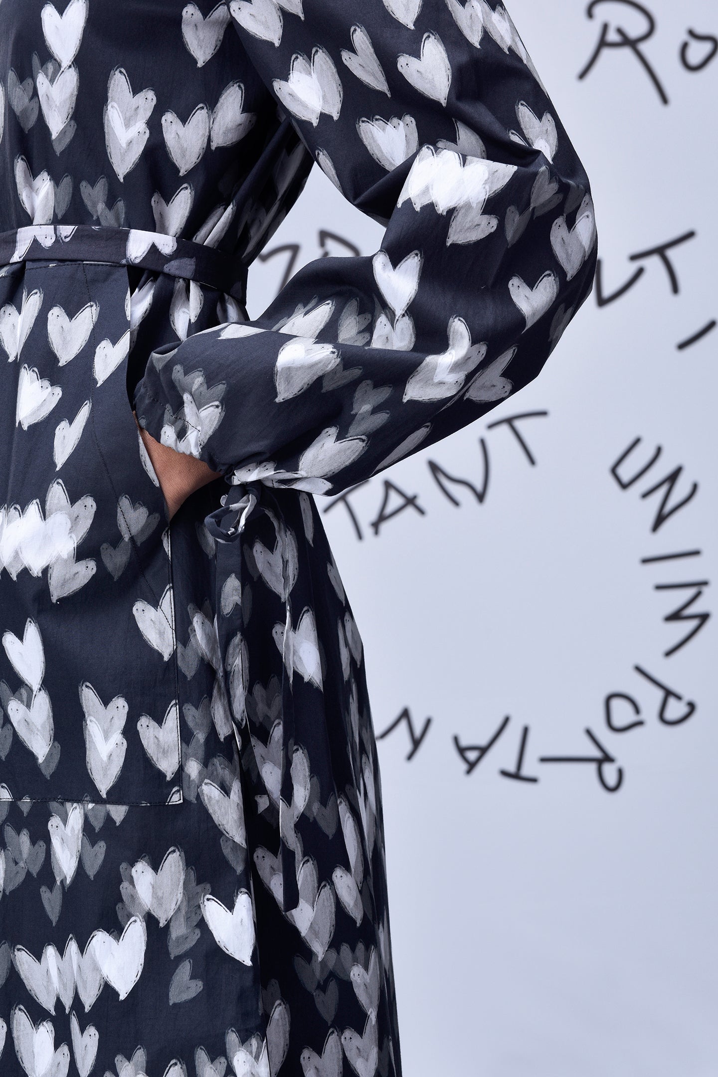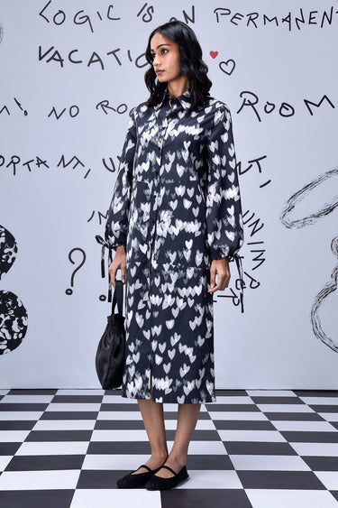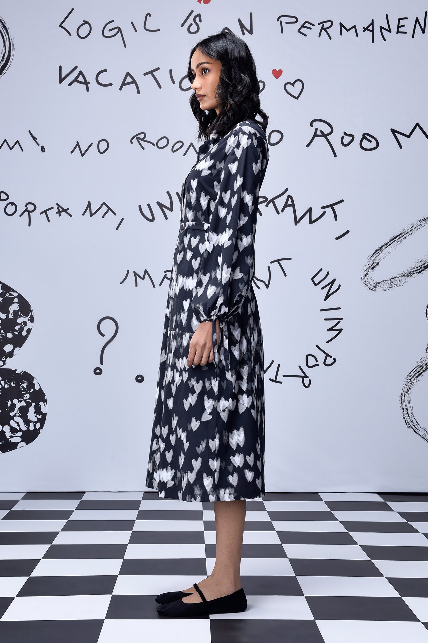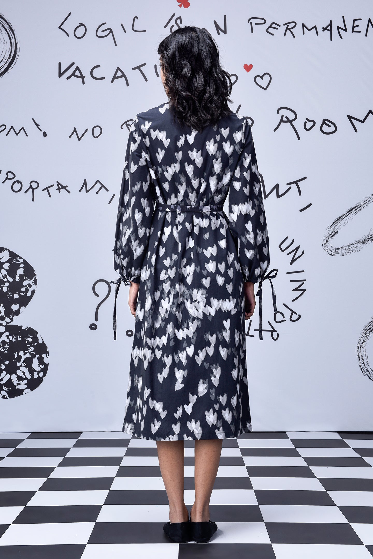 Elevate your wardrobe with our Heart Print Dress in Black. Our The Heart of Hearts Print is inspired by our co-founder Hemant's note “Every detail is meaningful, carrying emotion and nudging to look at the ordinary in an extraordinary way”. Lending a sentiment of visual chaos to the effervescent heart shape - this print story is a fresh take on a ditsy motif.
