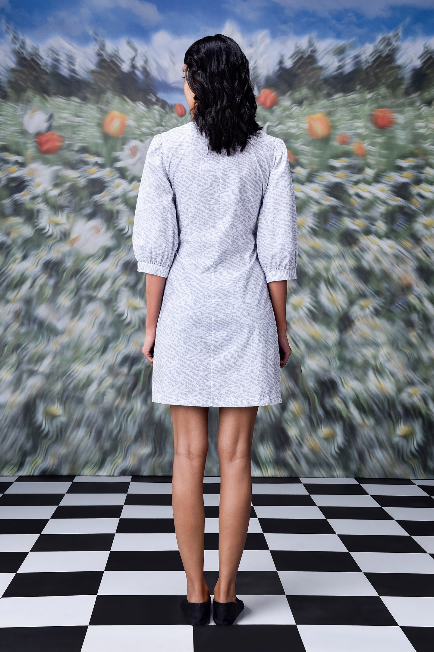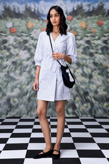 Featuring our Labyrinth Print Wraparound in Pearl Grey evoking sentiment of surreal intrigue, in arresting hues of grey.