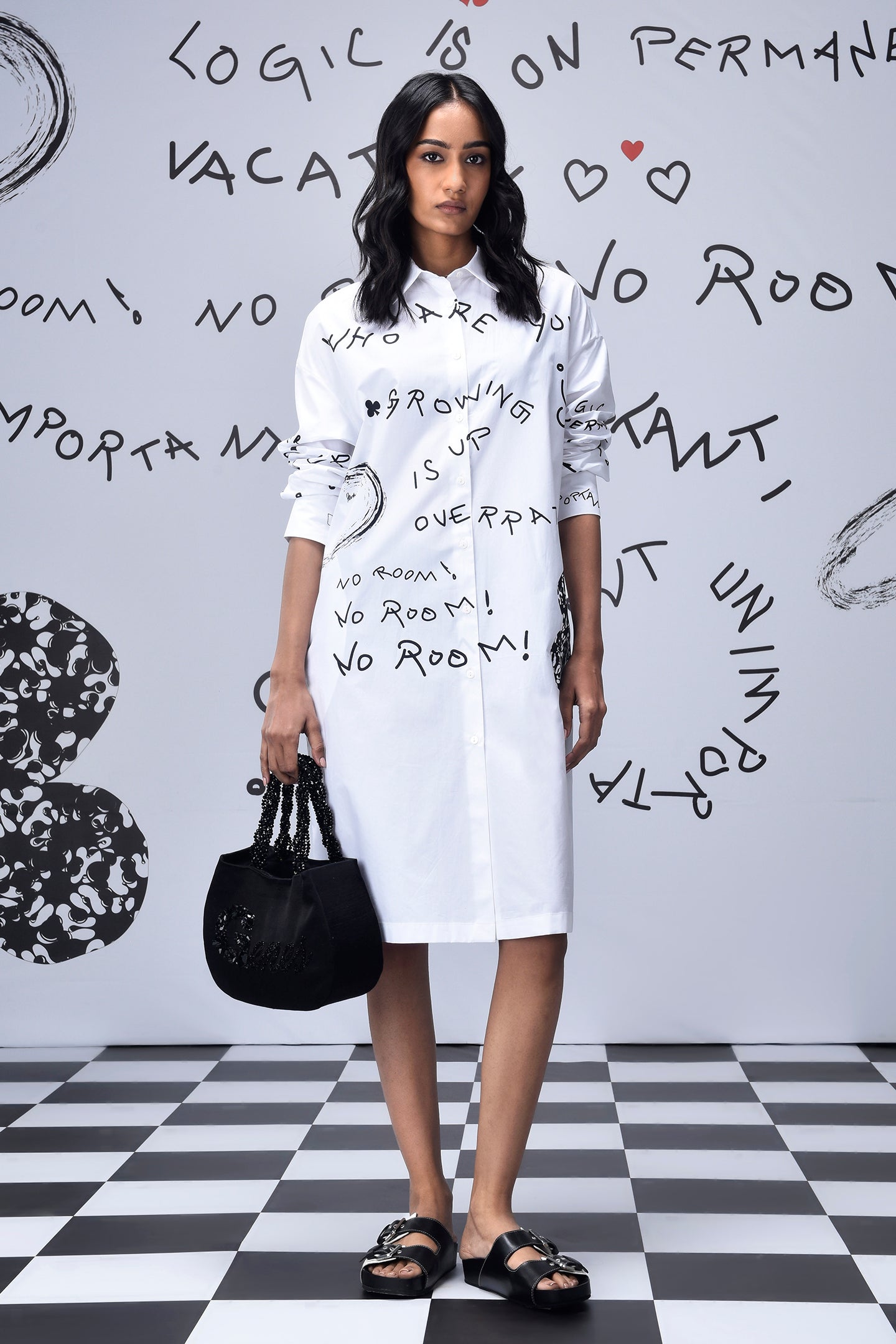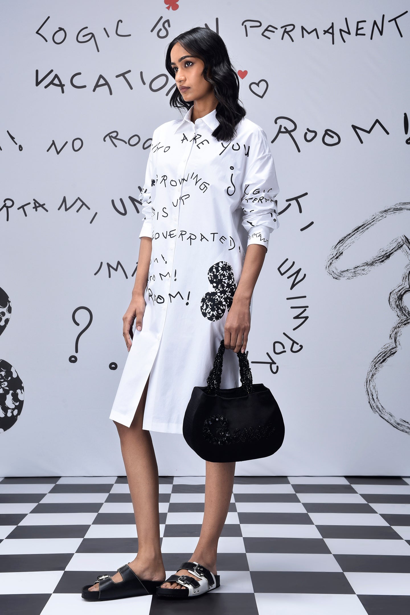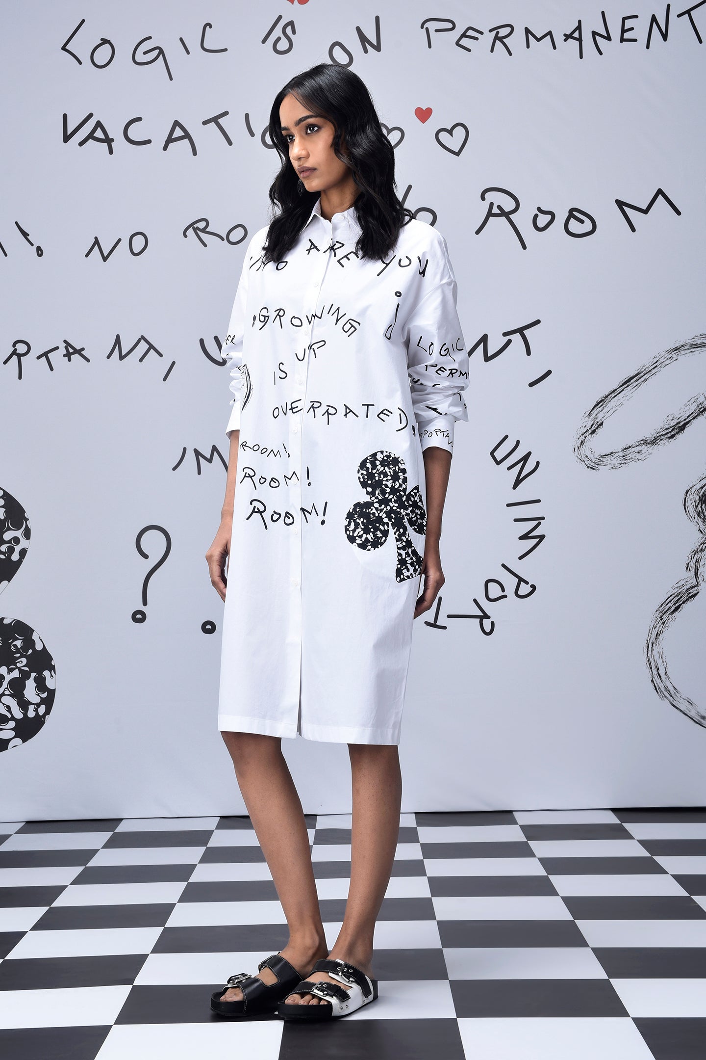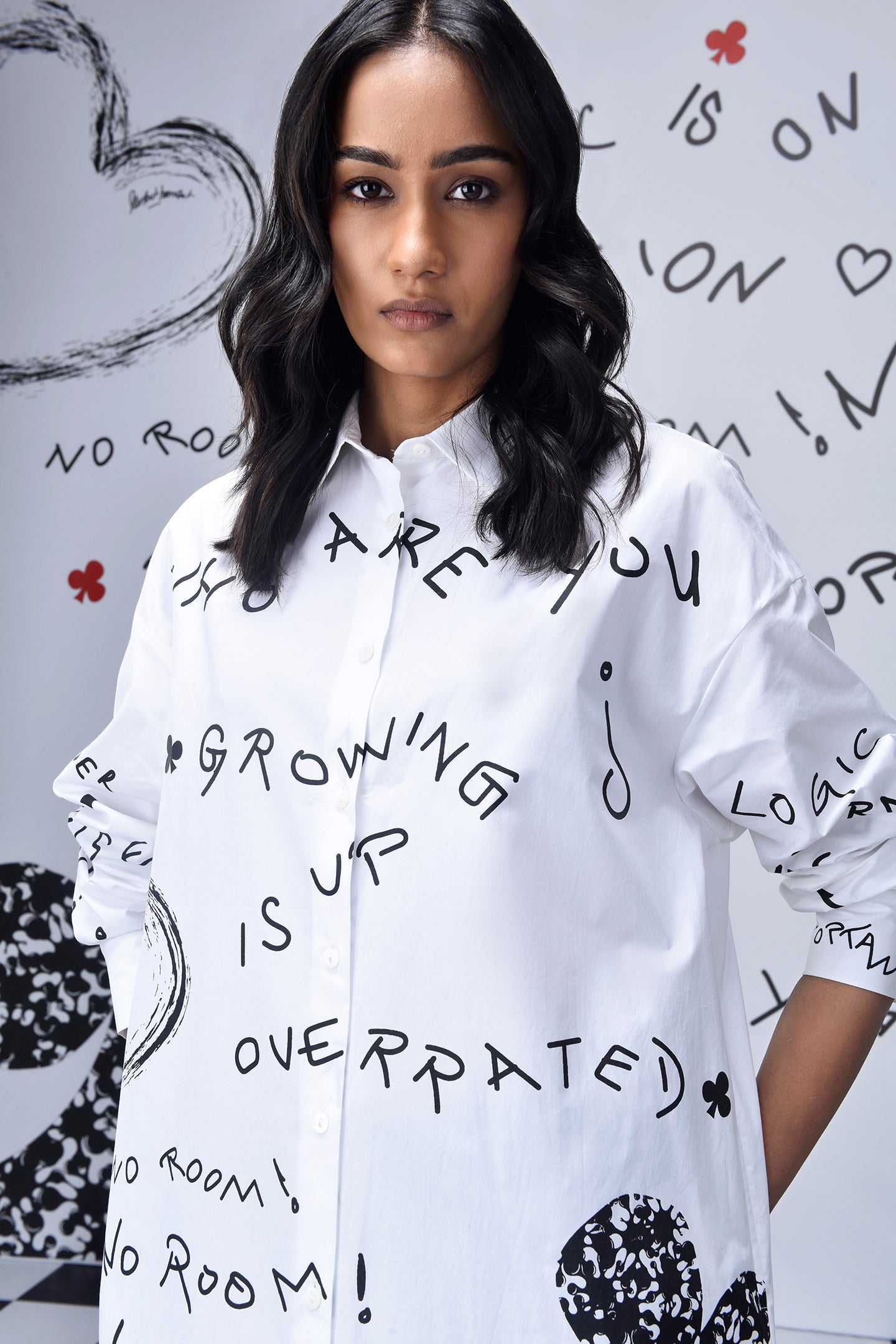 Presenting a classic button up, Scribble Text Shirt Dress in White with graffiti type print, evocative expression of joy with wise-crackers that add humor to everyday living.