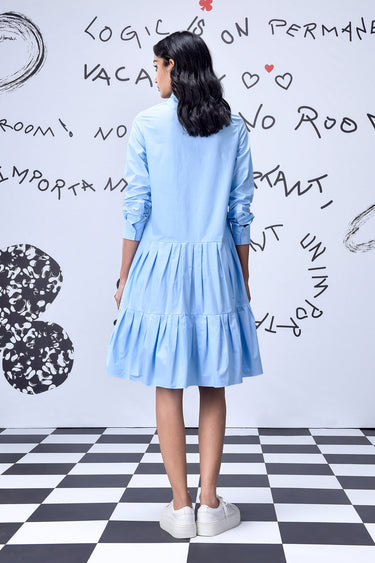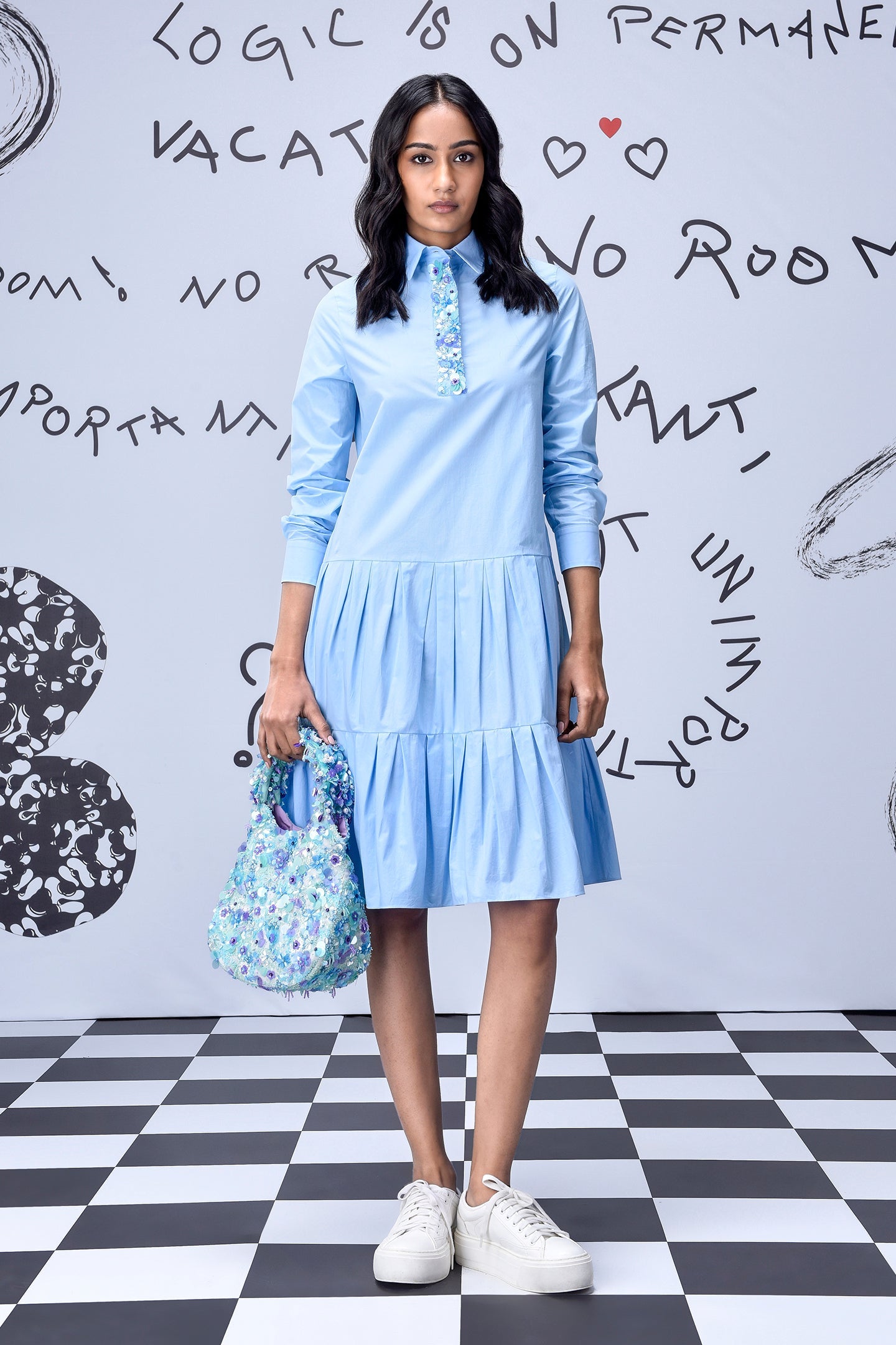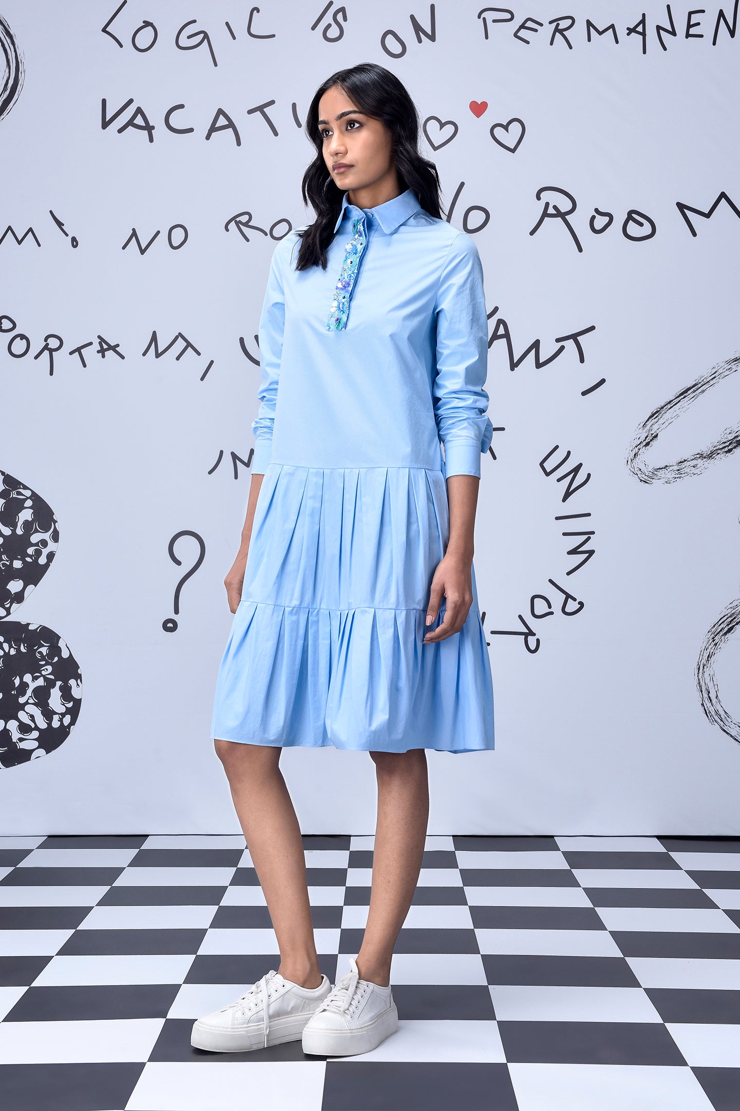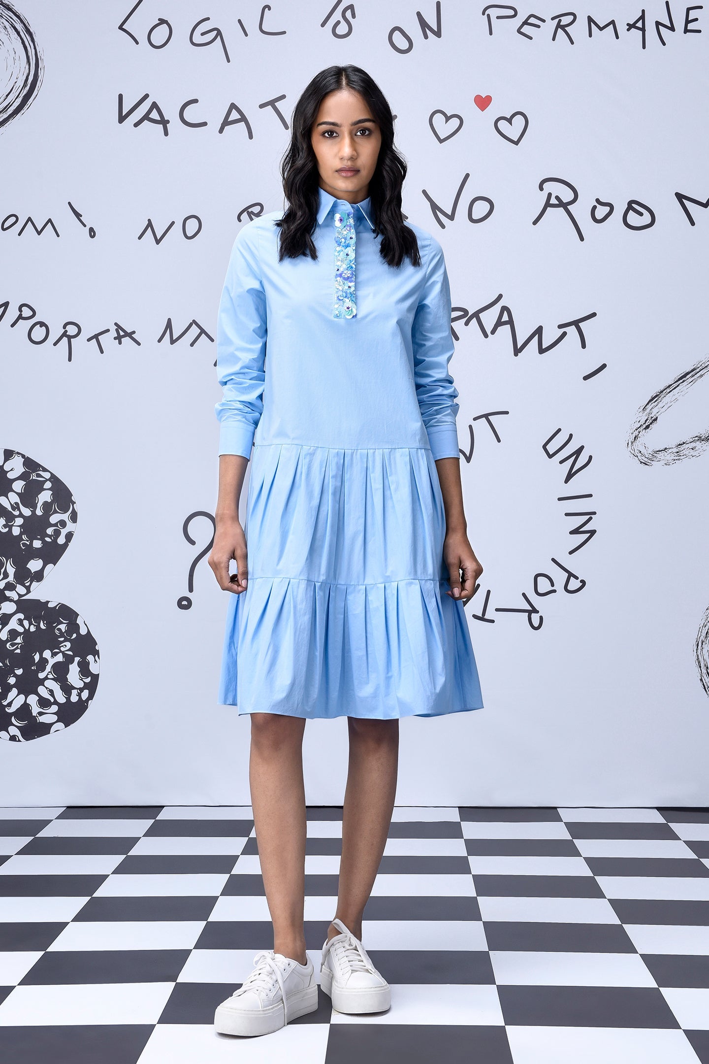 Presenting Sequin Placket Dress in Light Blue, effortless elegance with beautiful magical forest is interpreted through glittering sequins of varying forms and sizes details make this a comfortable choice for a fancy outing.