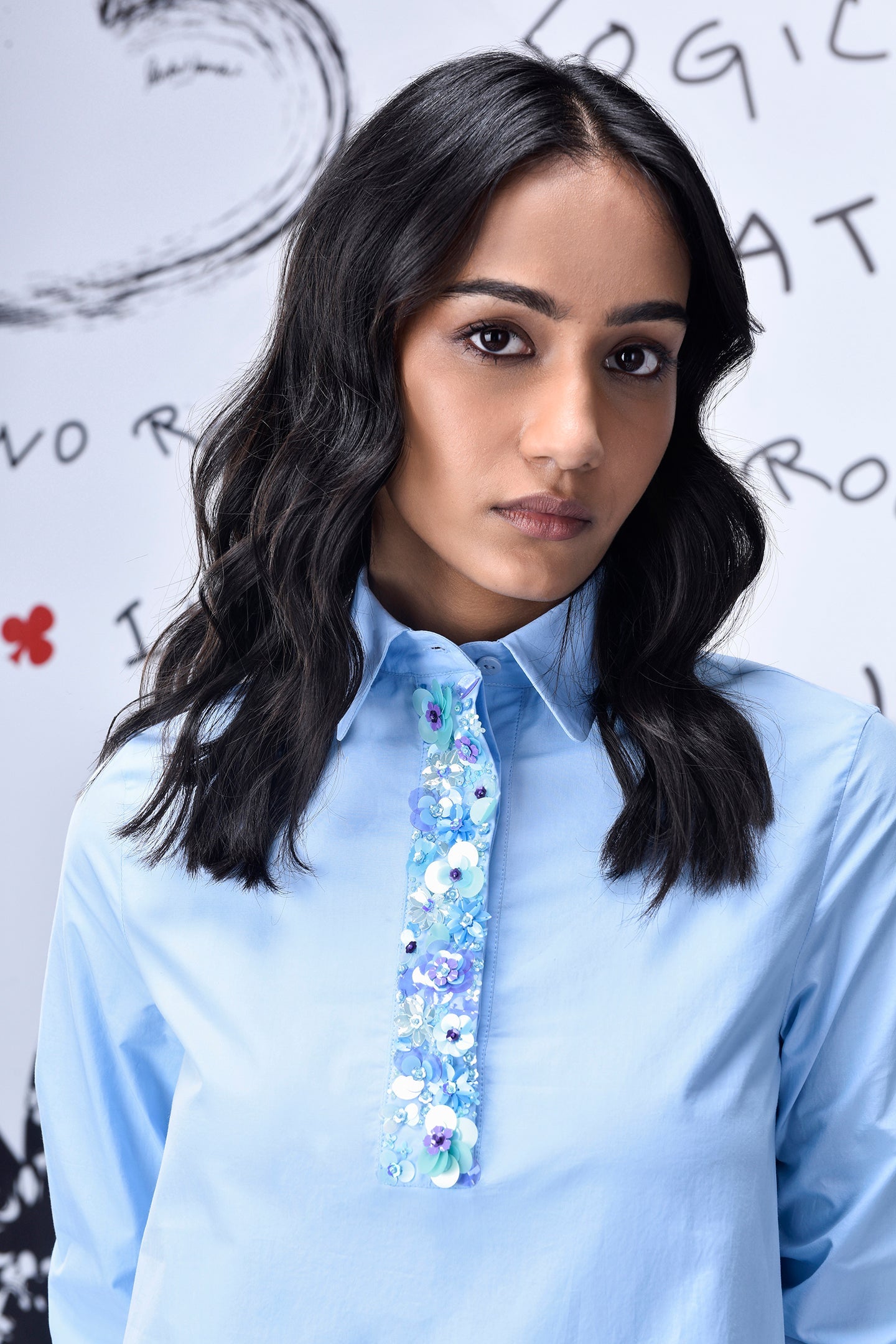 • Classic pointed collar, sequin half placket for a Sophisticated appearance.