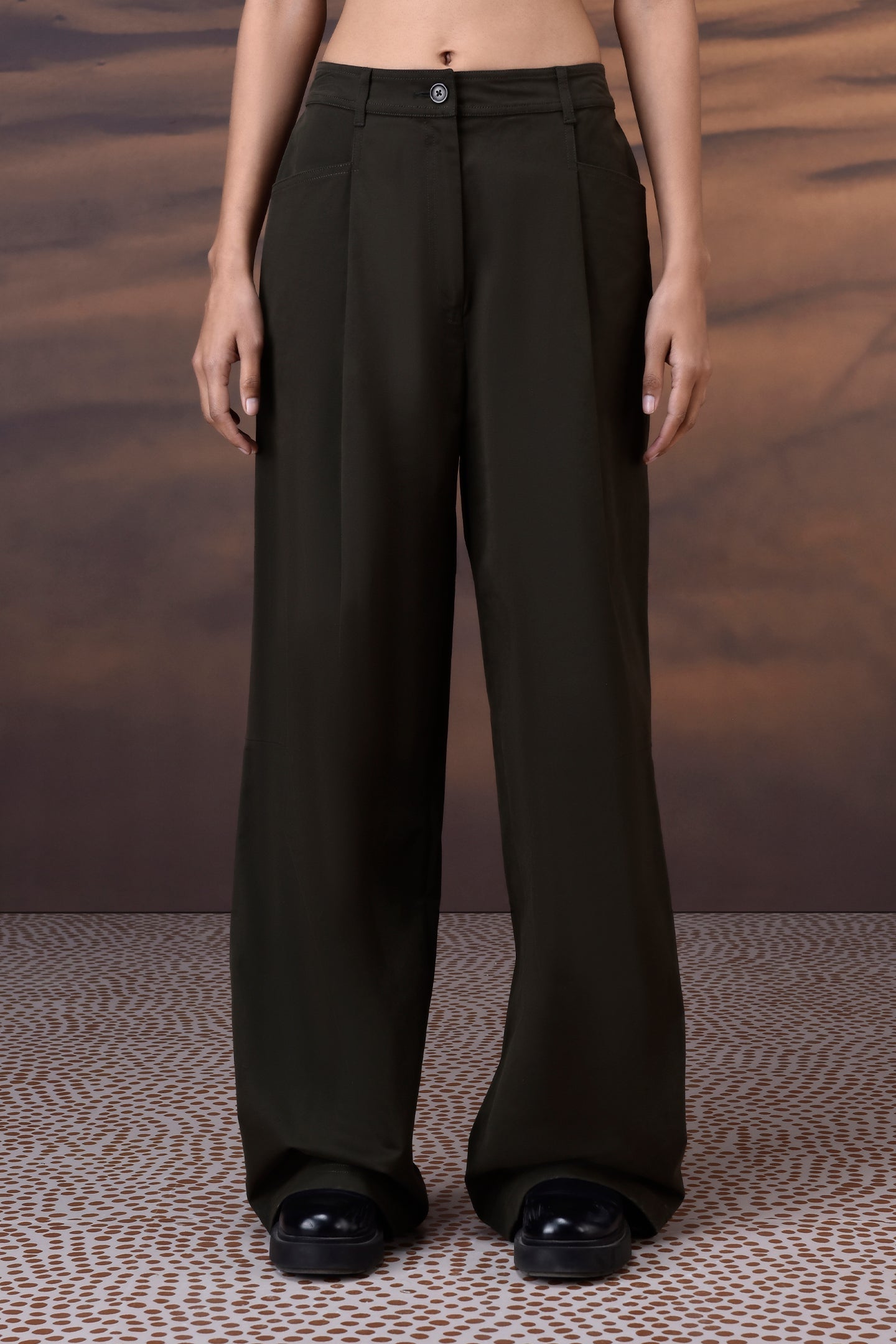 Cut from sturdy yet breathable cotton twill, these military green trousers deliver a modern utility edge with an effortlessly relaxed drape. Deep-set pleats streamline the silhouette, enhancing the wide-leg cut for a look that feels both casual and considered. A mid-rise waistband with belt loops anchors the fit, while angled front pockets and patch back pockets balance function with minimal design. The full-length cut elongates the frame, working seamlessly with sneakers, boots, or sandals.