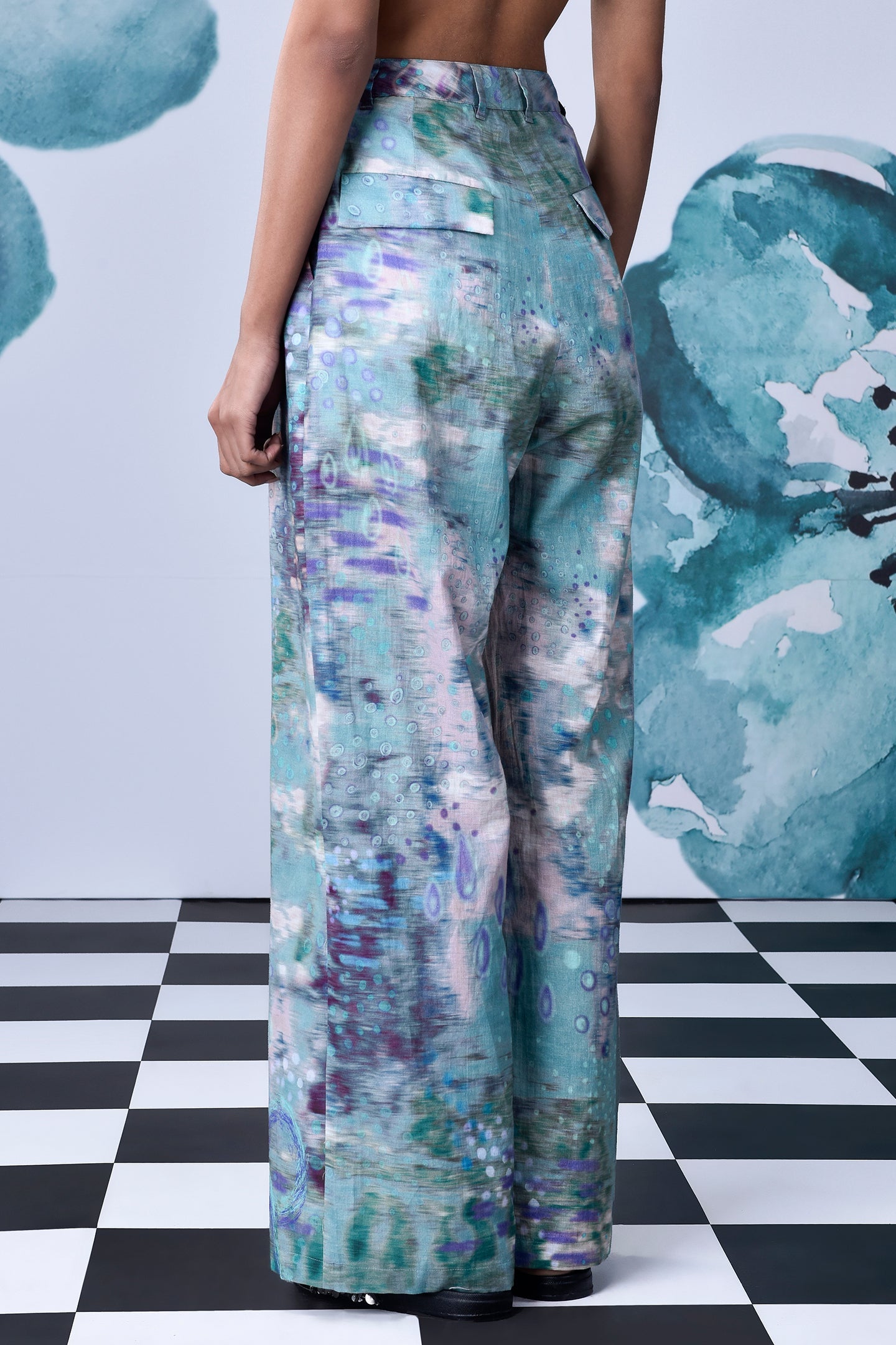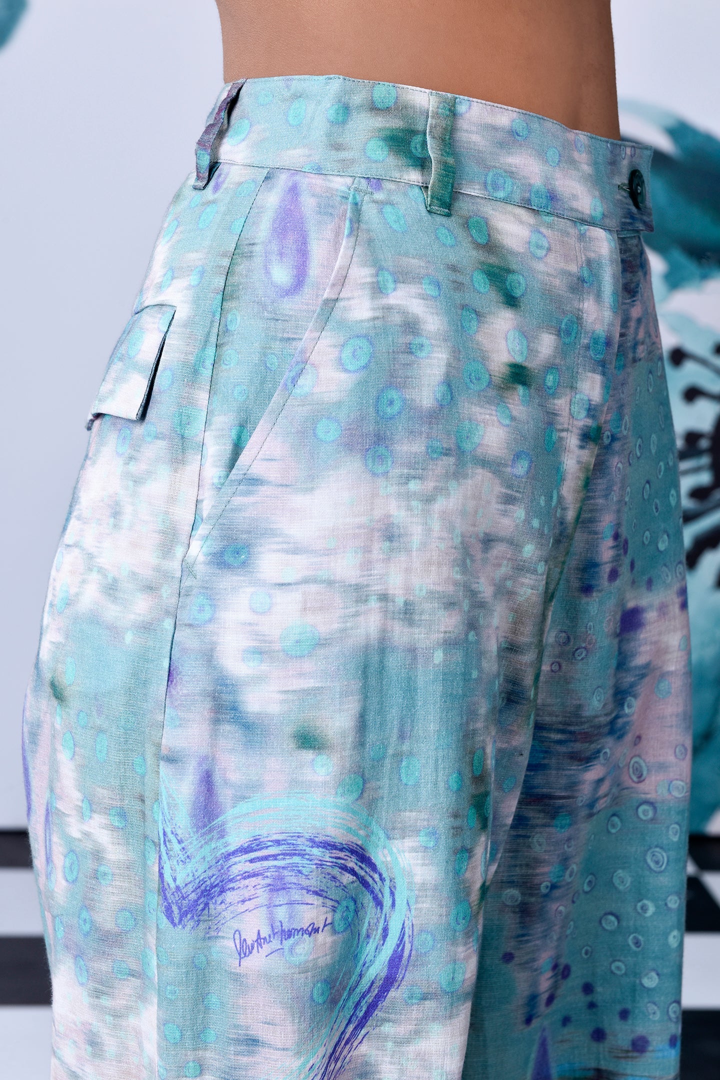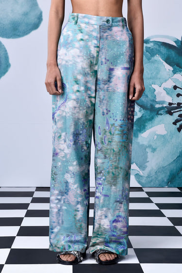 Featuring Pool of Tear Trouser in Nile Green inspired by the chapter in Alice in Wonderland where Alice is overwhelmed by her size. The emotions have been interpreted through a layered digital artwork of a dreamscape submerged in tear drops. Iridescent coral and lavender hues breathe life into this aquatic artwork.