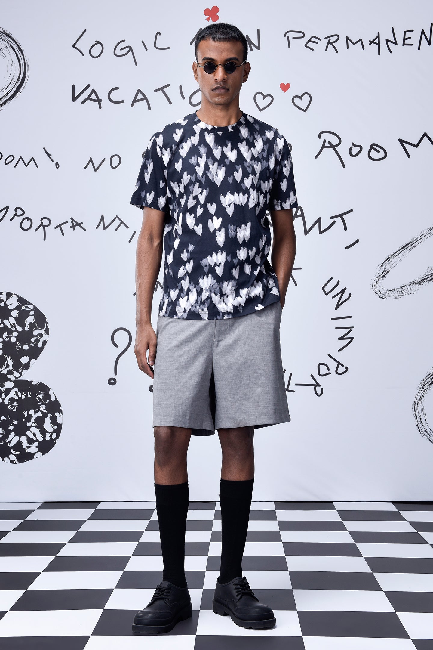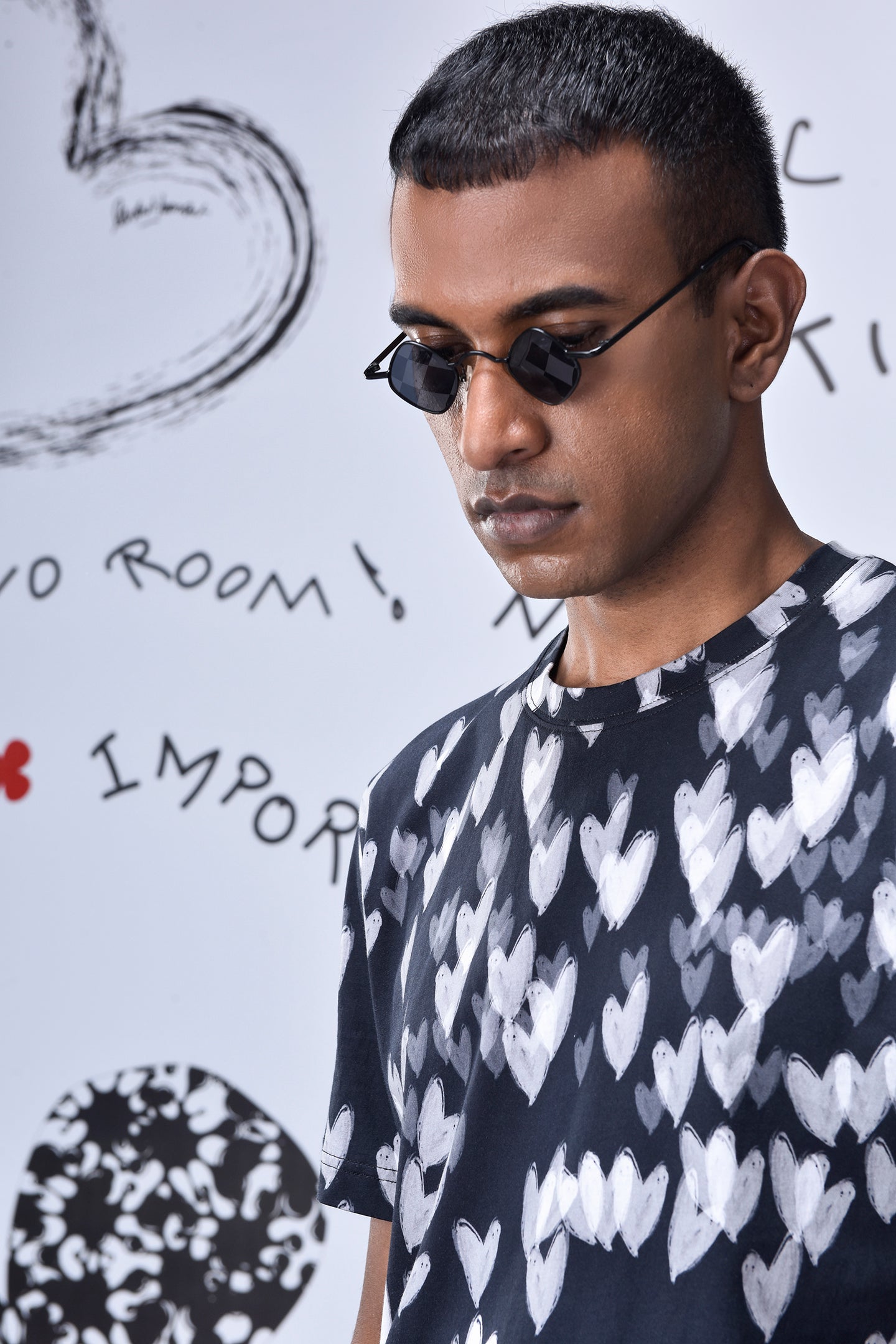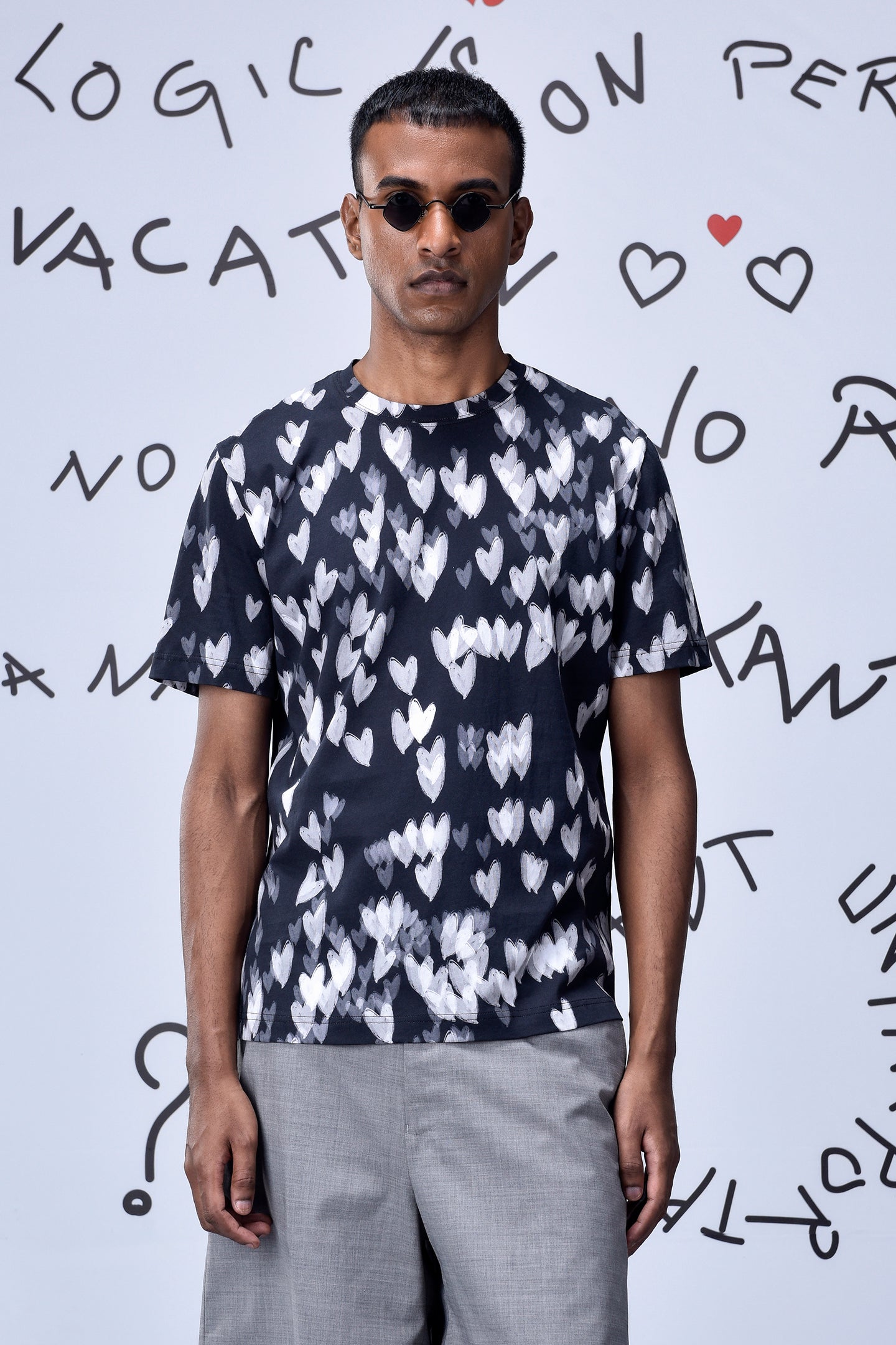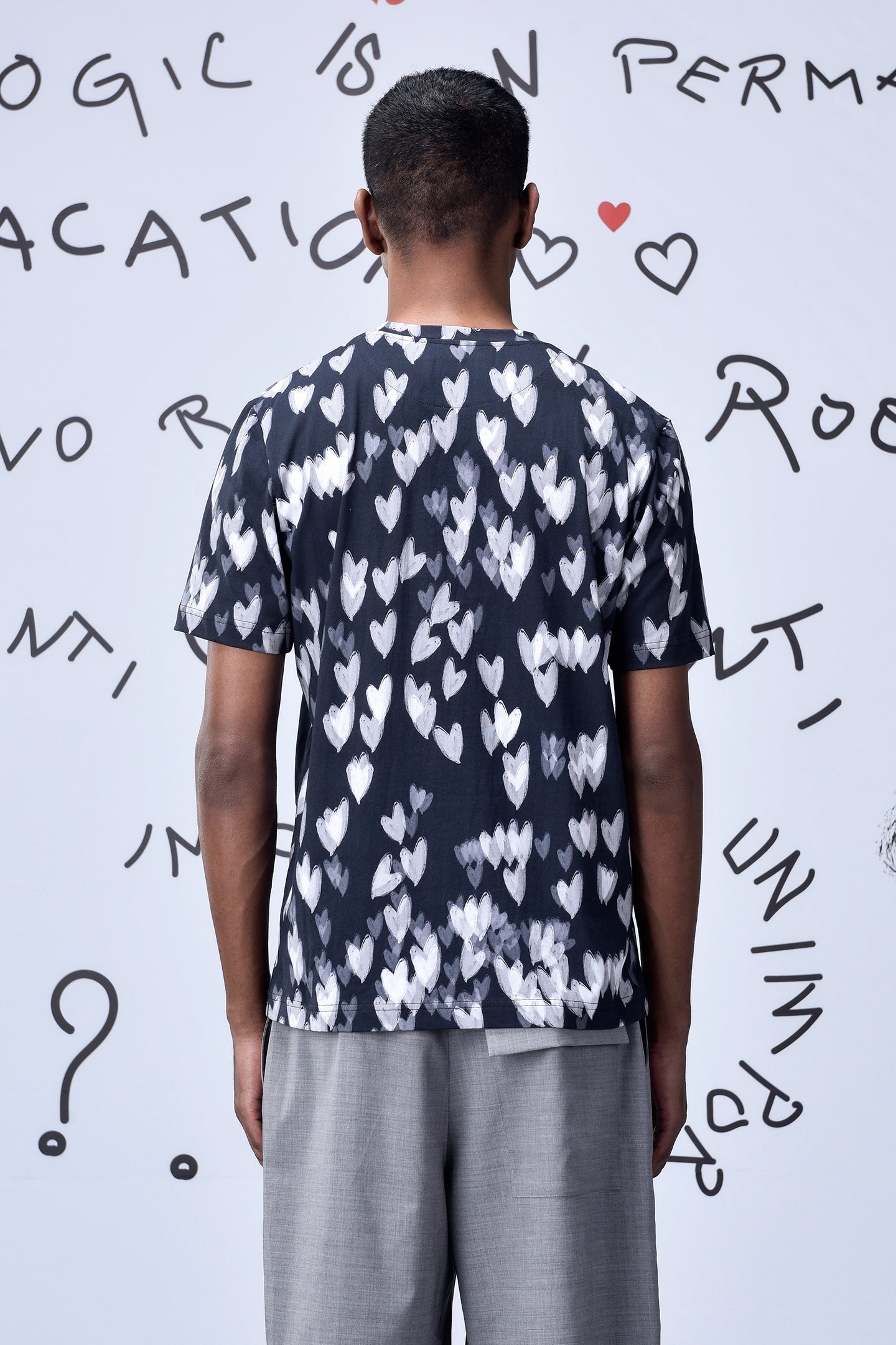 A statement in subtle expression, our Black Cotton Single Jersey T-Shirt features an all-over heart motif rendered in soft contrast tones. Effortlessly balancing comfort with artistry, it’s crafted for everyday wear that feels both expressive and understated.