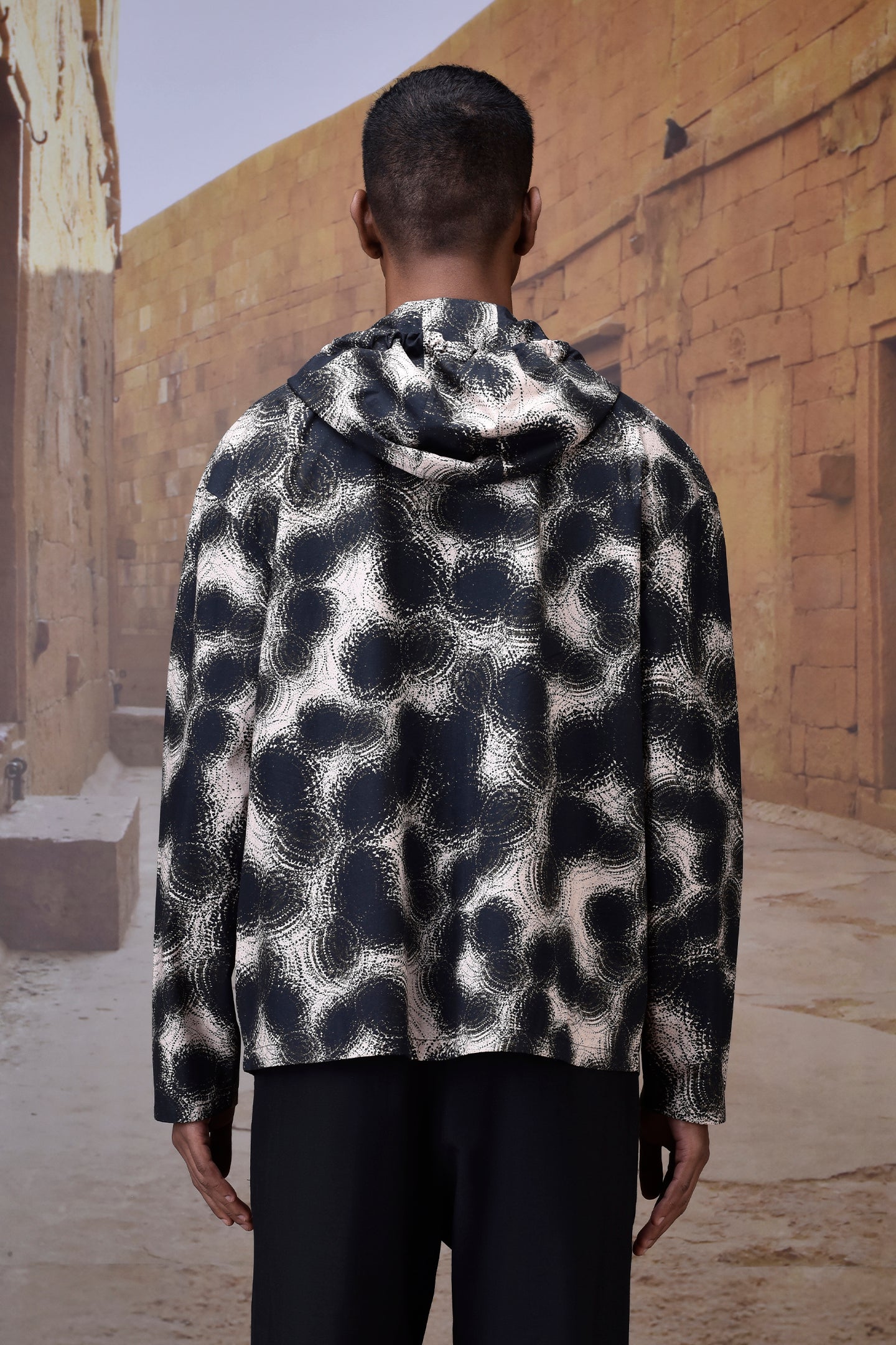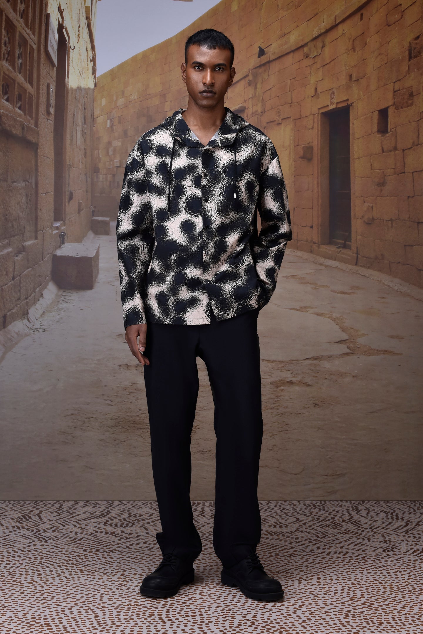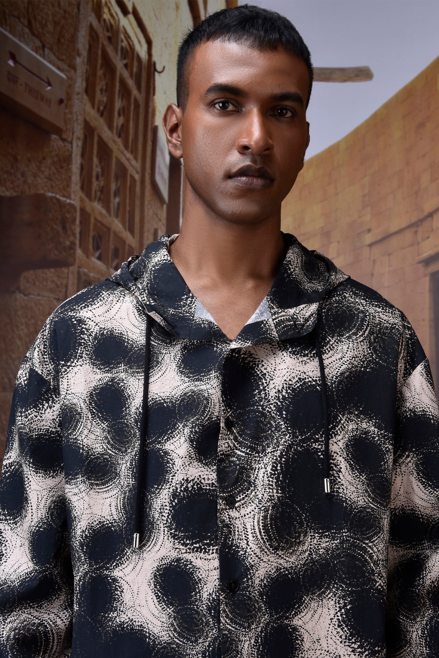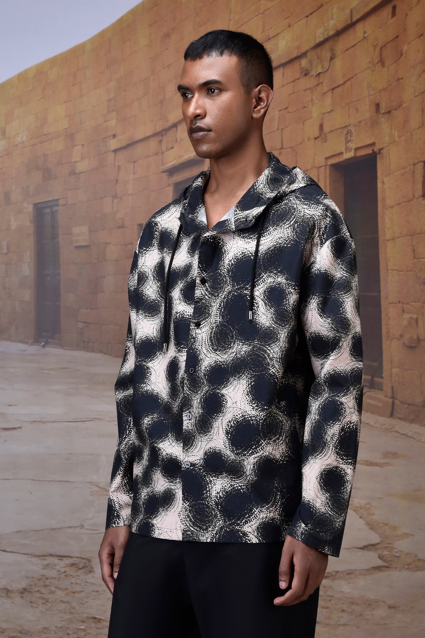 Cut from lightweight yet structured Giza cotton poplin, this black hood shirt reimagines casualwear with an artful edge. The abstract circular print creates a dynamic, almost three-dimensional effect, while the relaxed hood and button-down front strike a balance between streetwear ease and elevated tailoring. A straight hem and long sleeves keep the silhouette clean, making it a versatile layering piece across seasons.